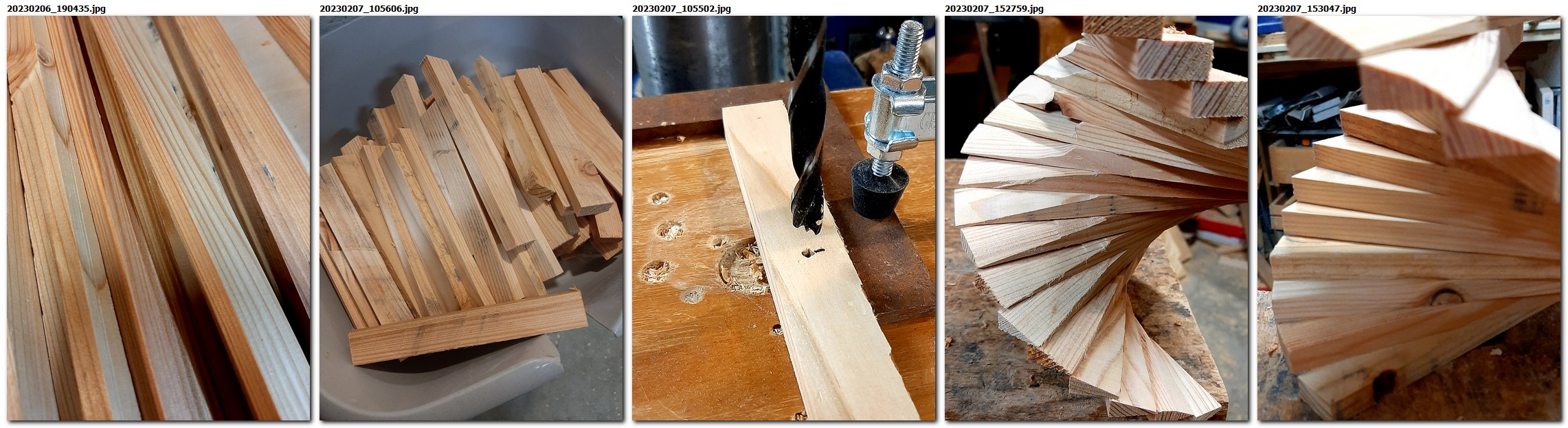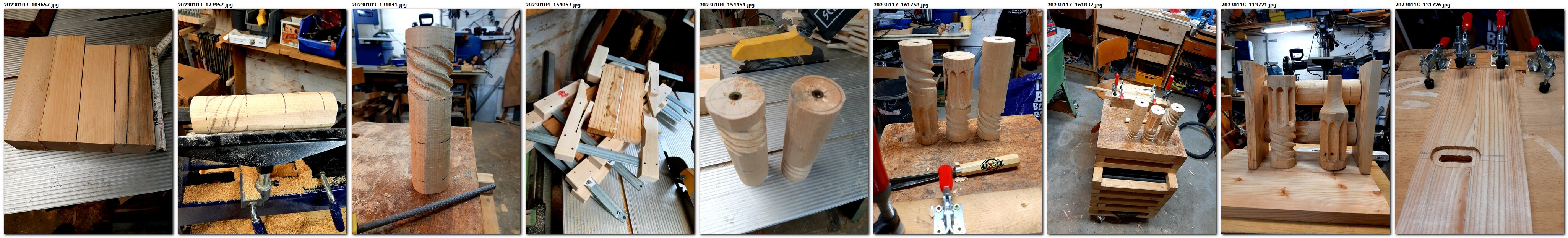 Lärchenbretter wurden zu Leisten in 150x20x10mm gesägt, gehobelt, zentral mit 8mm gebohrt, an einem Ende zunächst diagonal einseitig schräg abgeschliffen, auf eine 8mm-Gewindstange aufgefädelt und mit zwei Muttern stramm fixiert.