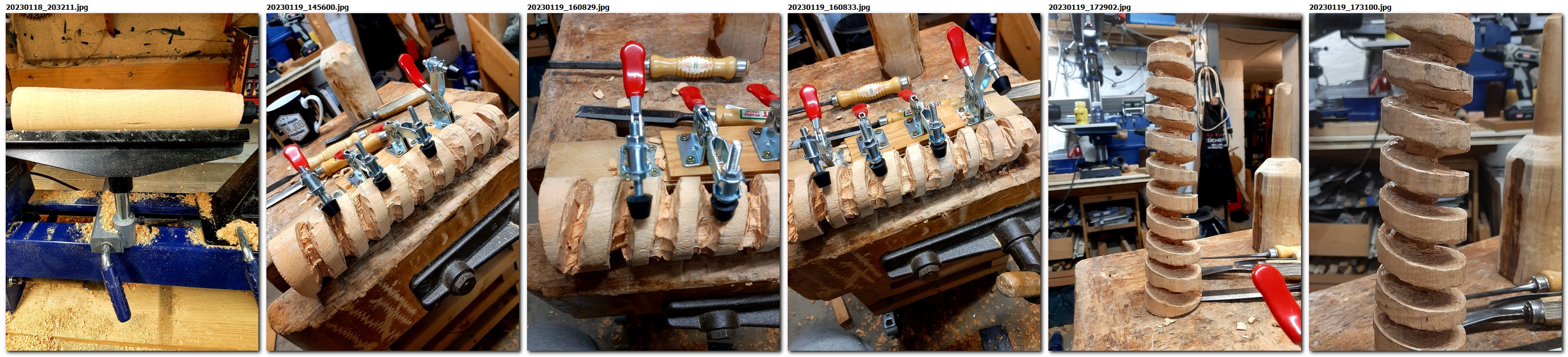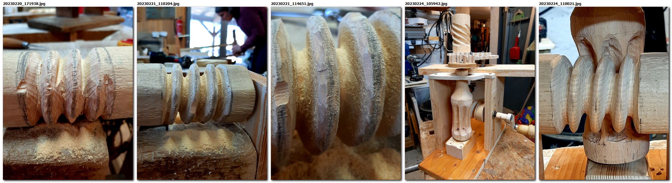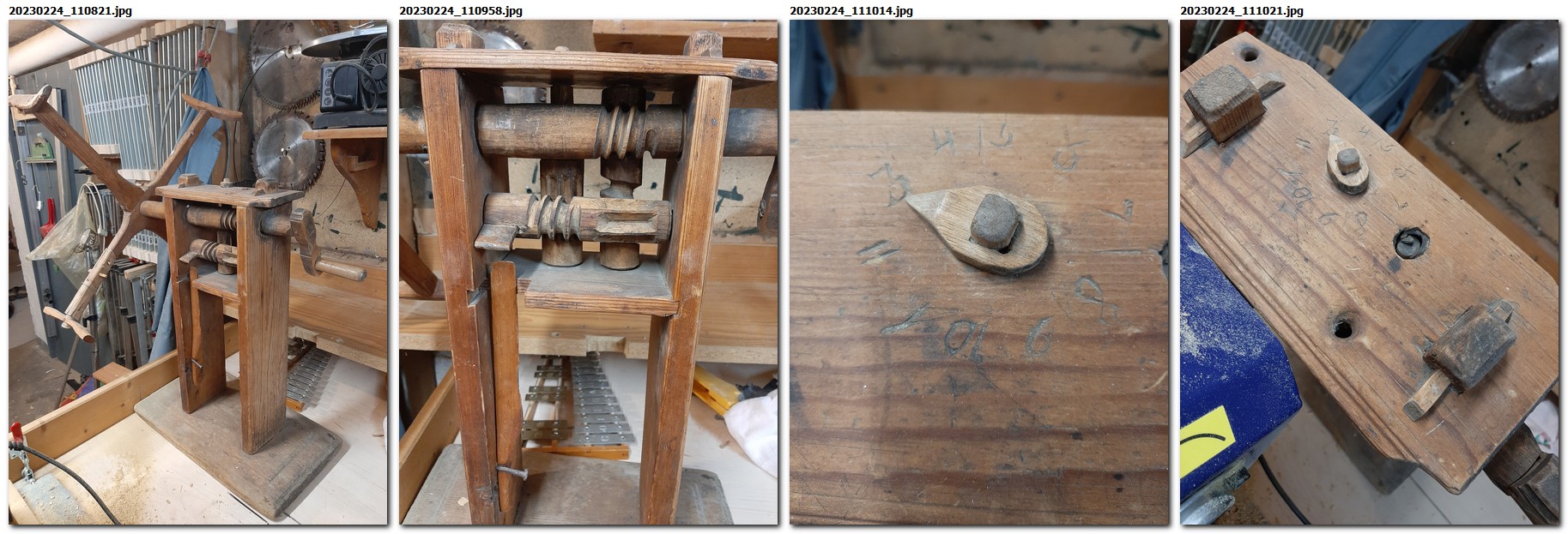 Zum Nachbau der Mechanik haben wir Linde benutzt, die zunächst gedrechselt und dann geschnitzt wurde. Falsch eingeschätzt haben wir nur den Neigungswinkel der Schnecke, da bis zu dem Zeitpunkt nur ein Handyvideo vorlag. Bei der oberen Welle ist jetzt deutlich zu erkennen, dass die Schneckengänge nahezu senkrecht stehen müssen. Liegen sie zu flach, sehen sie zwar schön aus, funktionieren aber nicht.