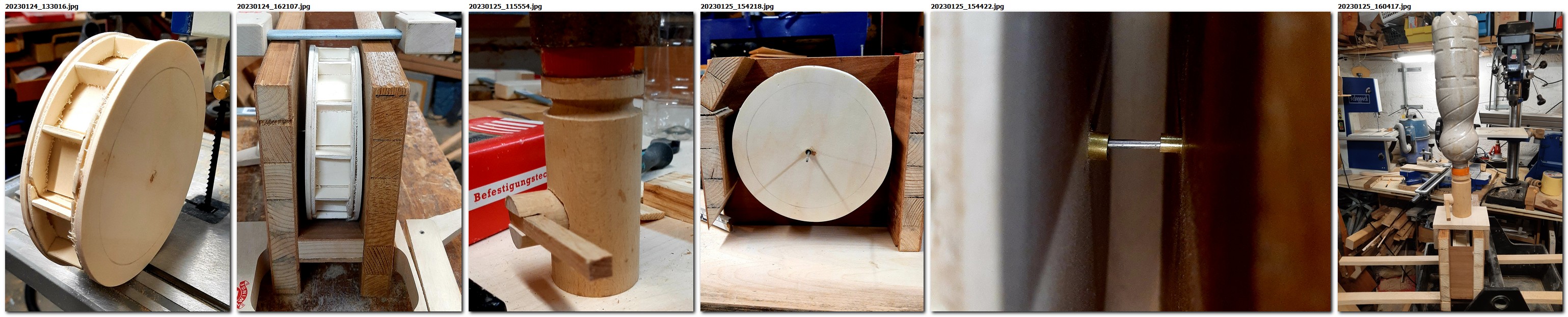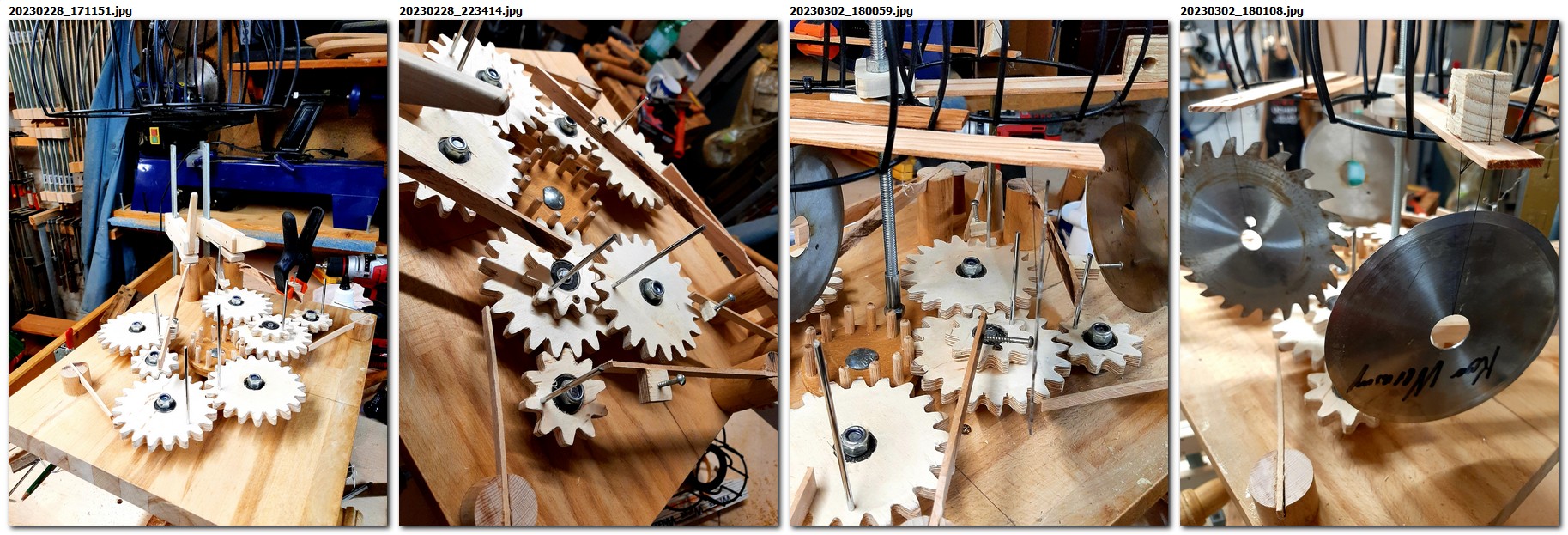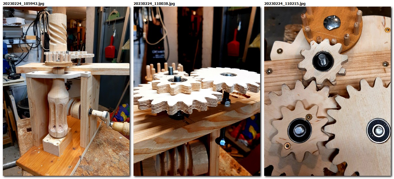 Mit Handschnitzmesser, Raspel, Feile und Schleifpapier lassen sich die Formen gut bearbeiten. Messen und berechnen hilft nicht weiter, das ganze braucht genügend “Spiel”, um zu funktionieren. Das die Bewegung sehr langsam ist, kann man gut mit Weichholz arbeiten, Fichte, oder eben Linde. Wenn die “Gänge” und “Zähne” gut ineinandergreifen läuft es, auch ohne Schmierung. Dann haben wir als Übergang ein “Dübelzahnrad” eingefügt, wie wir es früher schon bei einigen Spielzeugen eingesetzt hatten, besonders hier ab 09:59.