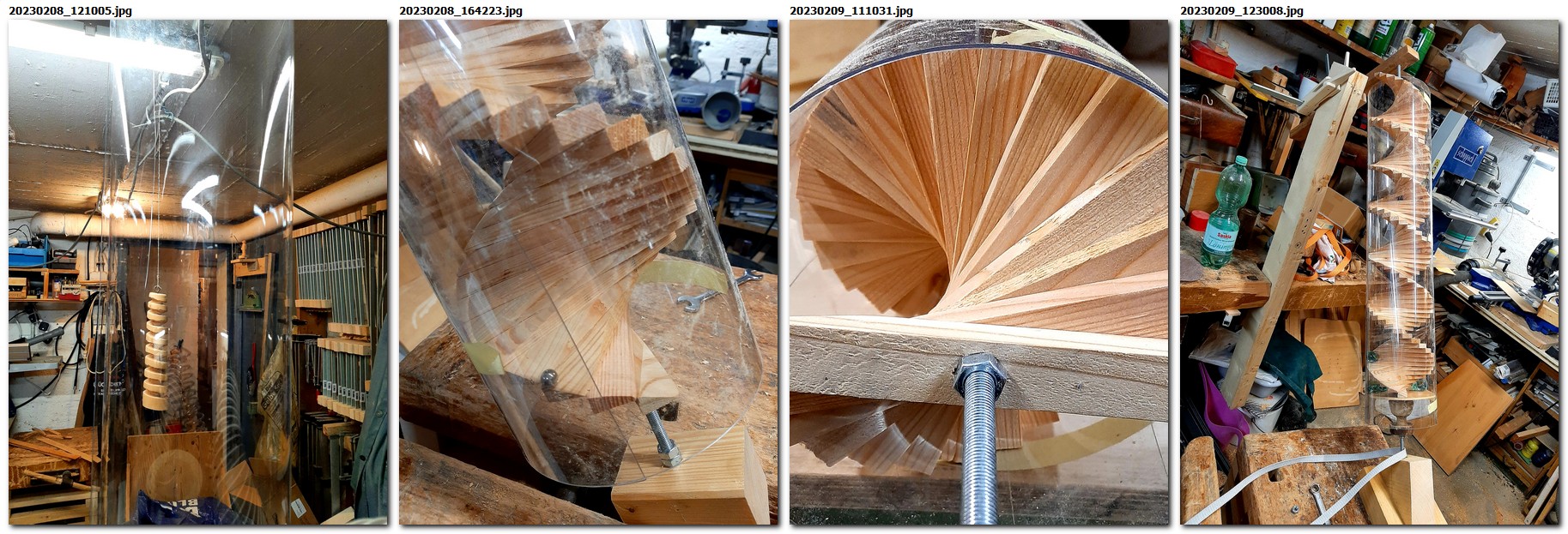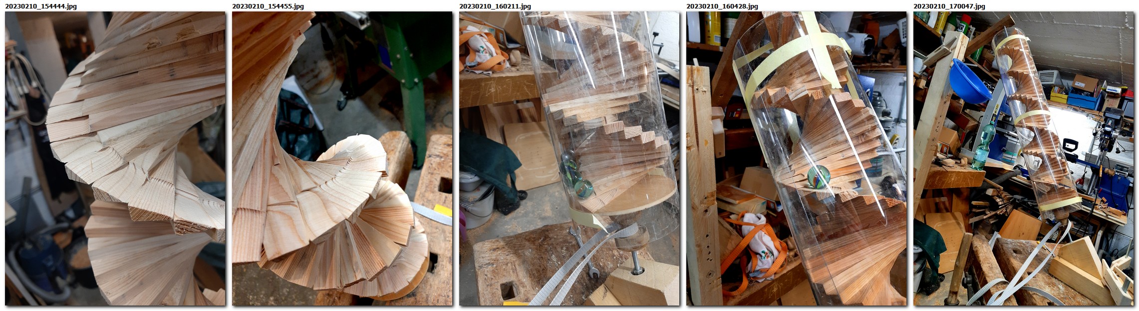 Eine archimedische Schraube zu schnitzen ist eine Herausforderung für sich, denn die zentrale Achse, die für die Stabilität sorgt, verschwindet zunehmend. Je tiefer die Rinne ausgearbeitet wird, desto fragiler wird das ganze Objekt. Verfolgt man dann noch die Idee, dass Wasser oder Kugeln aufwärts transportiert werden sollen, bleibt nur die Möglichkeit, das Ganze zu verkleiden. Deshalb wurde ein anderer Weg gewählt und die Schraube einfach als Windspiel aufgehängt.