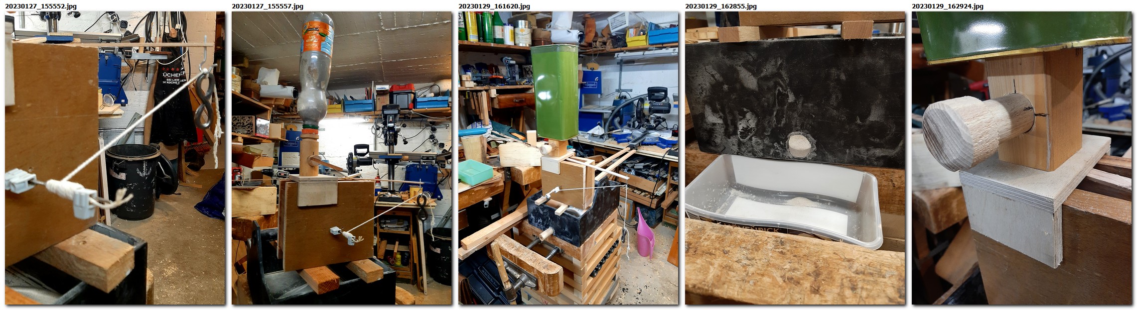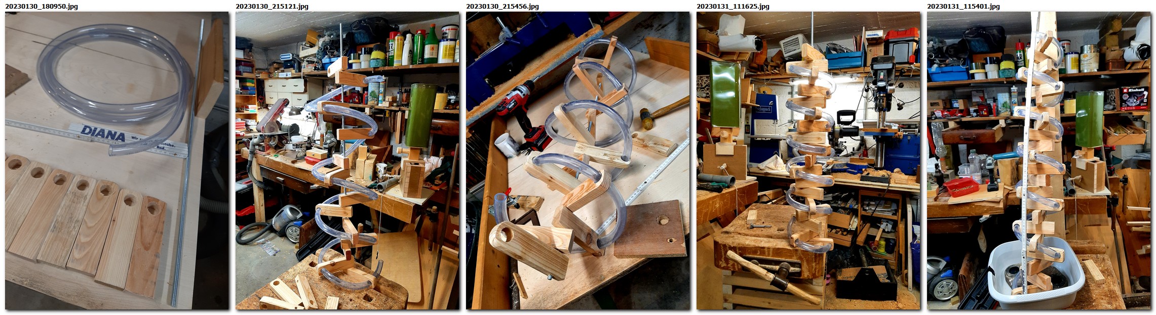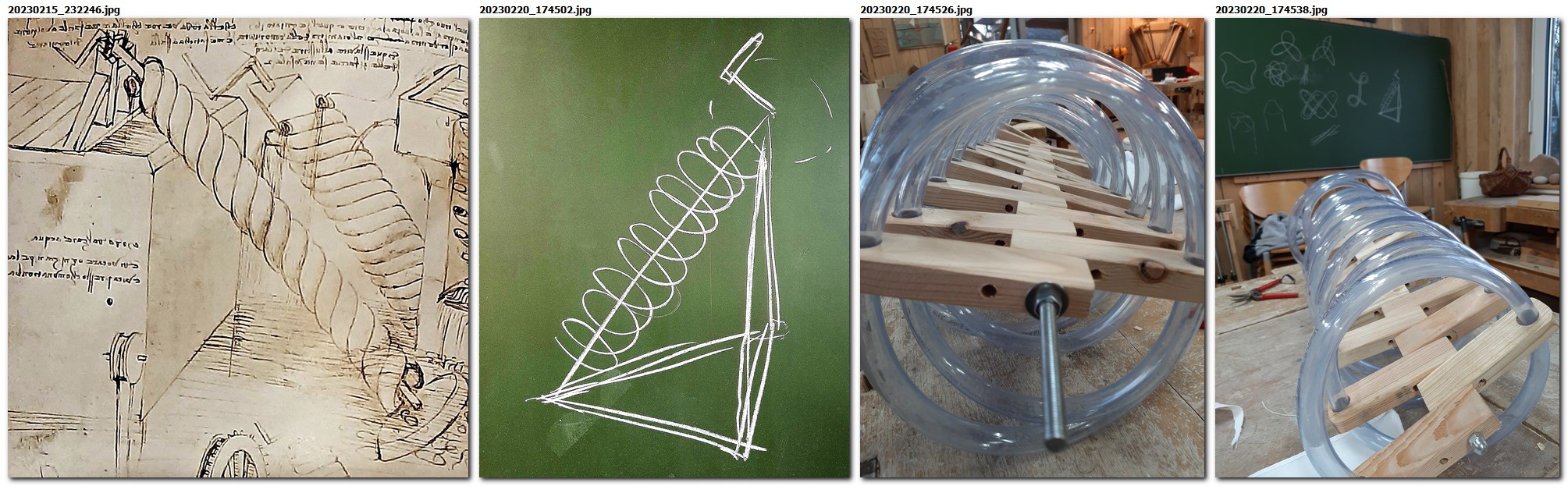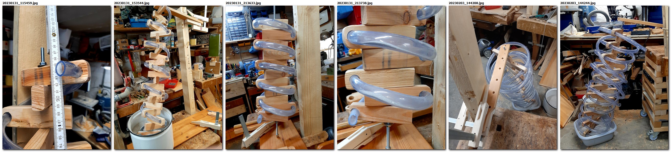 Ausgangspunkt war die Frage: Wie bekommen wir den Sand zurück in den Behälter? Im Anfang war es nur ein Versuch: ein Stück Schlauch, ein paar Hölzer, eine Achse und dann nochmal derselbe Fehler wie bei den Schneckengängen: sie lagen zu flach. Anders ausgedrückt: die Zahl der Windungen auf einem Meter Strecke war viel zu gering. Eine Beförderung in die Höhe, das war der Plan würde nicht funktionieren.