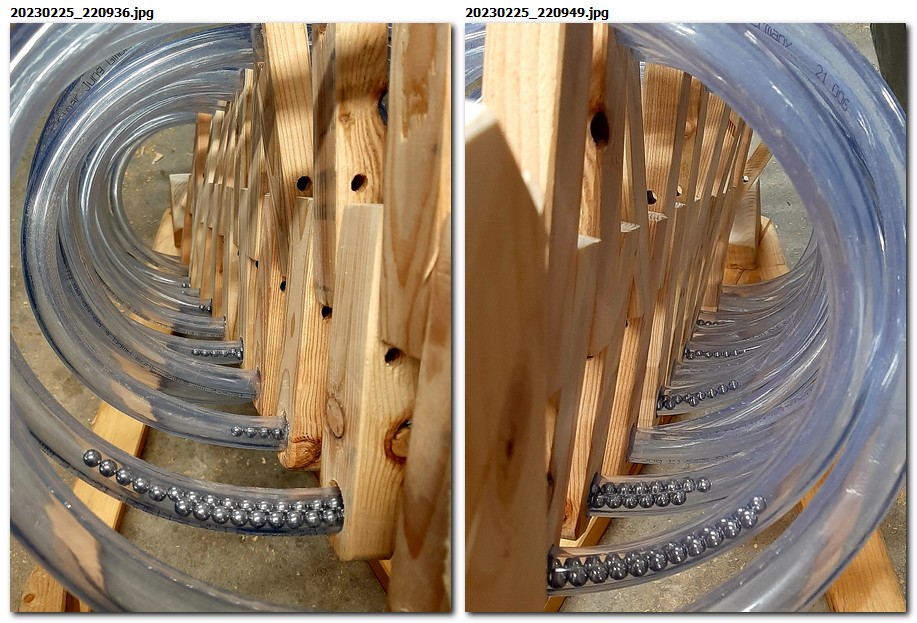 Dann kam die Idee auf, den Radius der Windungen zu verkleinern. Für Wasser wäre das kein Problem gewesen, für Kugeln schon, den das sehr stabile Schlauchmaterial begann sich in der engen Windung zu verformen.