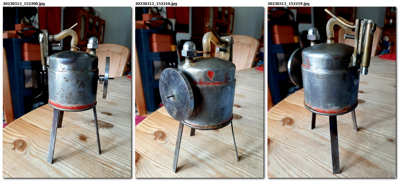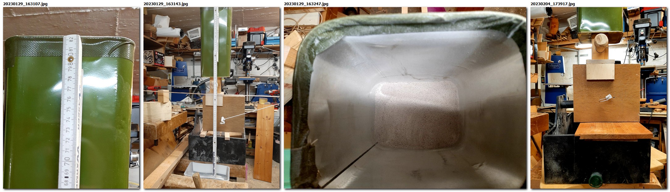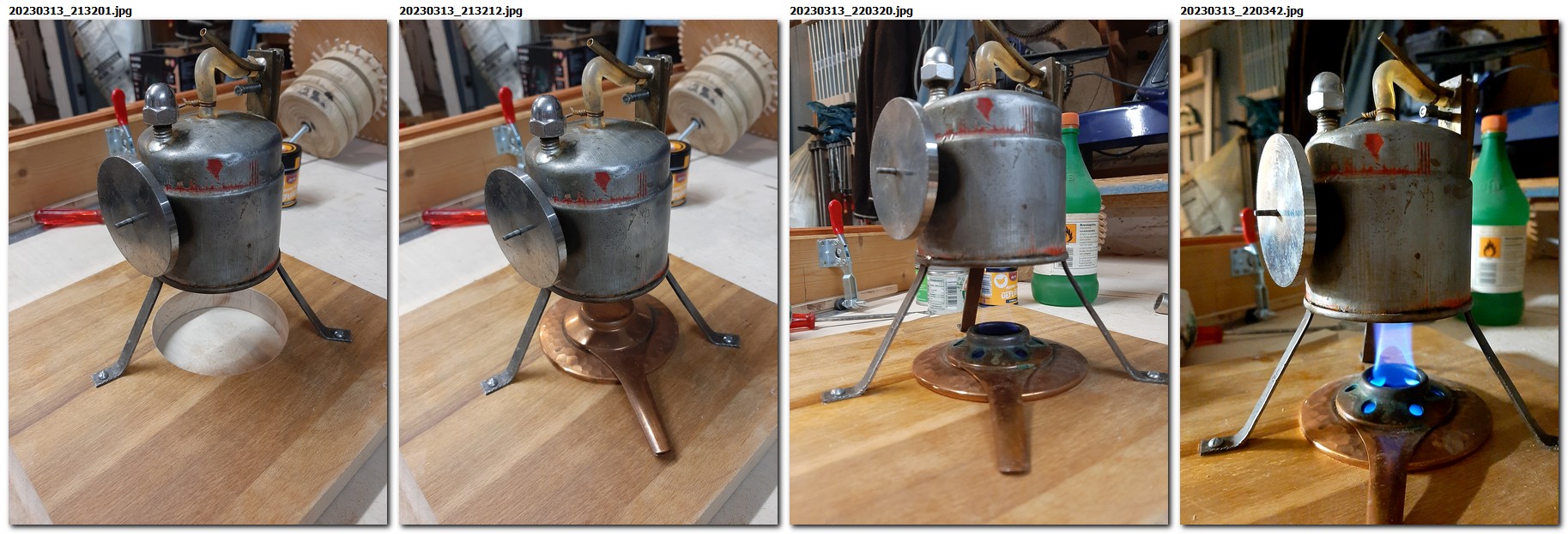 Die drei Beine werden jetzt auf ein Brett geschraubt und dieses zur Aufnahme des Brenners zwischen den Beinen ausgesägt. Die Füllung mit Wasser, etwa bis zur Hälfte, ermöglicht eine Laufdauer von mehr als einer halben Stunde, wobei man öfteres Ölen nicht vergessen darf.