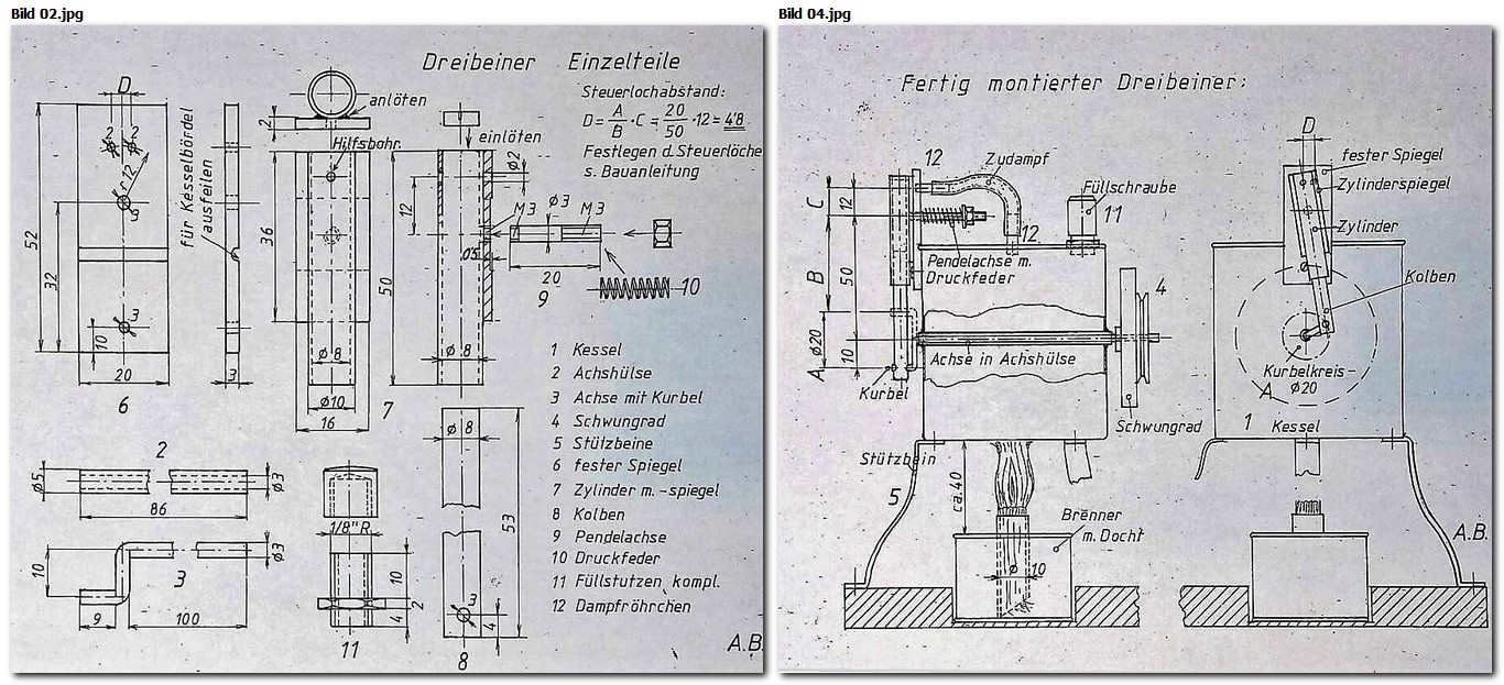Sie besteht aus den beiden Spiegeln, Zylinder, Kolben, Pendelachse, Druckfeder und Mutter. Die Dampfein- bzw. -ausgangsröhrchen sind dieselben wie im Kesseldeckel.