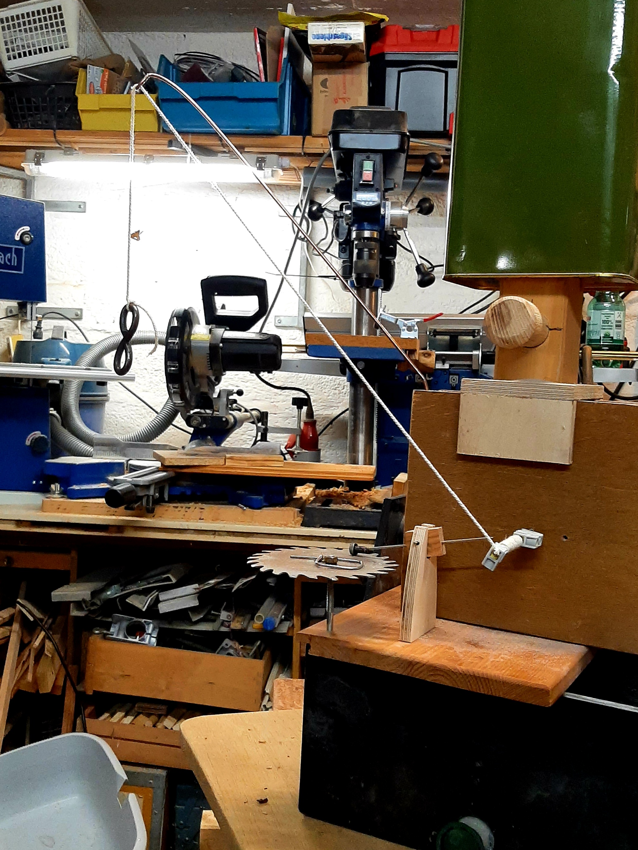 Eine gleichartige Maschine, jetzt schon aus einer wesentlich günstigeren Campinggas-Kartusche und stärkerem Spiegel gebaut, steht auf einem abgedrehten Holzring und einer Marmorplatte. Hier wurde schon etwas besser mit Silber gelötet. Das wird aber später behandelt.