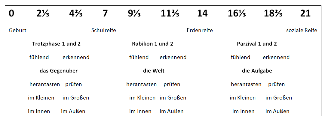 Die Jahrsiebenschritte des Erdenlebens kennzeichnen jeweils den Moment einer Ankunft auf einer „neuen“ Lebensebene. Dem tatsächlichen Entwicklungsschritt auf die nächste Stufe geht jeweils eine „Reifung“ voraus. Äußere Lebensbedingungsfaktoren beeinflussen diesen Prozess zwar, im Grunde ist es aber einer, der einer komplexen inneren wie äußeren Ordnung folgt. Die Zeitstruktur ist fest, das Tempo, in dem gelebt wird, ist in sich konsequent. Alles hat seine Zeit. Dieser Spruch hat Gültigkeit.