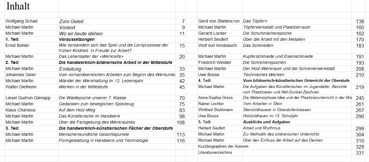 “Das Buch wurde verfasst von Werklehrern, die in der Praxis des Schulunterrichts stehen und seit vielen Jahren in den verschiedenen Bereichen des künstlerisch-handwerklichen Unterrichts der Waldorfschulen arbeiten. Die Berichte der Werklehrer enthalten die Ergebnisse ihrer pädagogischen und sachlichen Erfahrungen, ihre fachlichen Zielsetzungen, sind aber auch Ausdruck ihrer individuellen Eigenarten. Das muss so sein, denn der Erzieher an der Waldorfschule kann und soll aus dem Einsatz seiner ganzen Persönlichkeit heraus tätig sein. So wird jeder Lehrer seinen Weg zu einer Erziehungskunst suchen. Wie verschieden diese Wege der einzelnen auch sein mögen, so gemeinsam ist ihr pädagogisches Anliegen, das sie in den Dienst der durch Rudolf Steiner initiierten Erziehungsaufgabe gestellt haben. Diese Gemeinsamkeit bot die Grundlage für das Werk.”