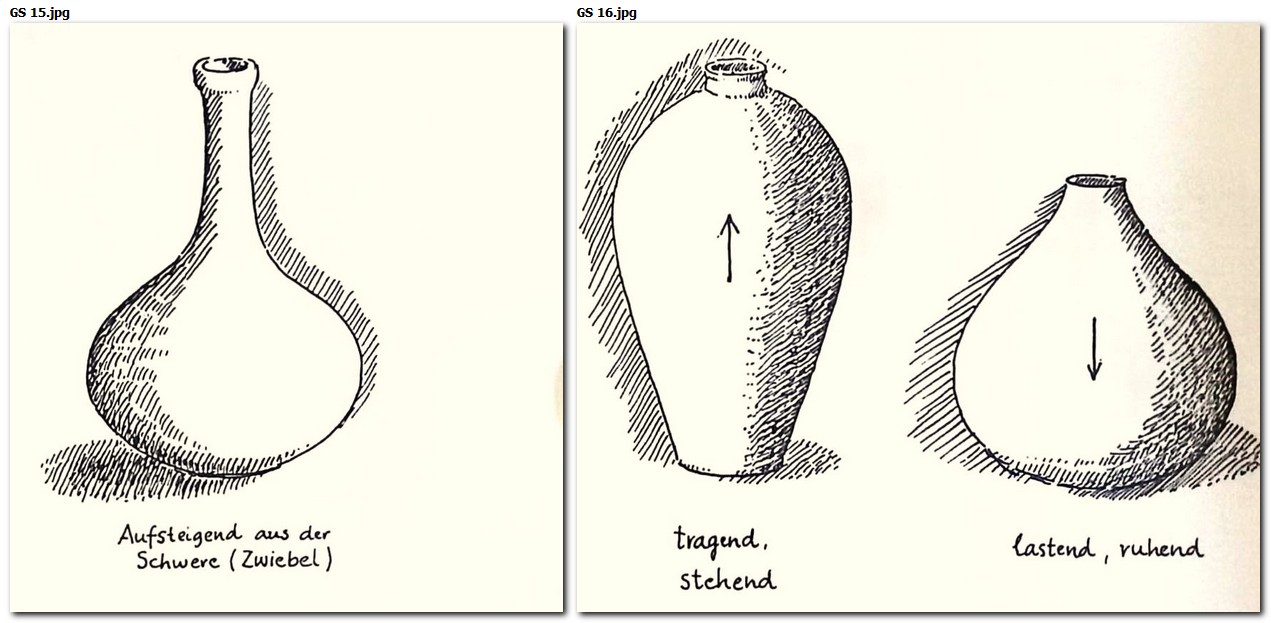 Und nun kommen wir schon zu den nach oben sich stärker abschließenden Krug- und Vasenformen, mit einer Schulter oder einem Kragen und einem Hals. Schließlich zur Dose mit Deckel, zur Tee- und Kaffeekanne und zur Flasche - Gefäße mit geschlossenen Innenräumen, die ihren Inhalt ganz umschließen, mehr oder weniger bewahren und warmhalten. Wir können in all diesen Formen Verwandtschaft mit der Leibesgestalt des Menschen sehen. Wir können aber auch menschliche Gesten und Gebärden sehen, die in ihrer Grundanlage verwandt sind mit den Vokalformen der Eurythmie; dem sich öffnenden Laut «A», dem einschließenden «O», dem emporstrebenden «U». Es sind Urformen, aus der empfindenden Seele geboren, die eine reiche, sich wandelnde, vielfältige Formensprache ergeben.