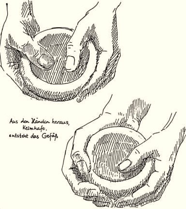 Wenn wir uns als den Mikrokosmos gegenüber dem Makrokosmos betrachten, dann können wir sagen: Aus unserem Kopf muss nun die Idee, das Bild dessen, was wir machen wollen, herein in die plastische Wirklichkeit, die wir mit den Händen formen wollen, den Tonkloß. Unsere Stirn, unsere Augen bleiben wie Sonne und Gestirne über dem Geschehen und wandern schauend, prüfend herum an dem sich drehenden Erdenkloß. Unser wollendes Wesen muss nun über unsere formenden Hände herein in das werdende Geschehen auf der Töpferscheibe, so wie es beim Marionettenspieler herein muss in die sich an den Fäden bewegende Puppe. Wir müssen ganz herein mit unserem Wesen in das neu beginnende Geschehen; es ist immer wieder wie ein Geburtsprozess: Formende Kraft, Leben wird ergriffen. Wasser kommt hinzu. Die Hände und der Tonkloß werden richtig nass gemacht. Der gesamte Drehvorgang findet nun im wässrigen Element, im gleitenden Zustand des Tons statt. Immer müssen Hände und Ton nass gehalten werden, der Ton darf niemals an den Händen reiben und bremsen.