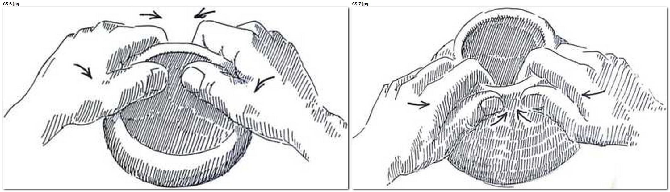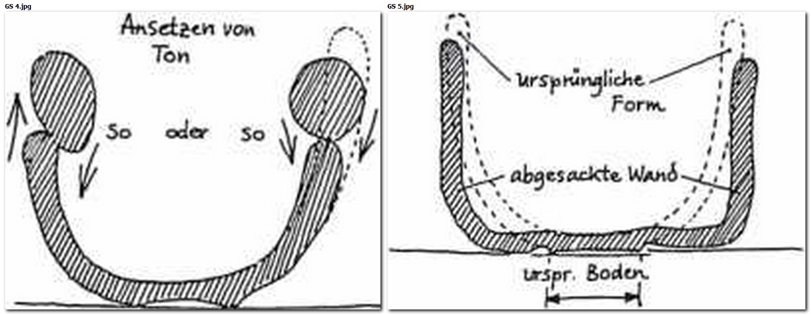 Bei jedem Dünner-Drücken der Wandung wandert sie von selbst nach außen - das ist ein einfaches physikalisches Gesetz der Massenverteilung - die Oberfläche wird vergrößert. Will ich die Wand steiler nach oben treiben, dann muss ich gleichzeitig einen ständigen Druck nach innen ausüben, der die Tonmasse zwingt, nach oben auszuweichen. Es entsteht beim Drücken von außen nach innen (die Daumen innen halten nur leicht dagegen) ein Stauchprozeß, bei dem man spürt, dass sich die Wand, vor allem wenn sie schon ziemlich dünn ist, falten möchte. Diese Schwierigkeiten führen leicht dazu, dass man schon vom Boden weg zu weit hinauskommt und bei noch feuchter Wandung und verstärktem Druck von oben (Gewicht der Tonmasse) die Wand über dem Boden nach unten absackt. Wenn diese Gefahr spürbar wird, muss man aufhören oben weiterzubauen, muss unten korrigieren und das angefangene Gefäß, wie schon beschrieben, mit dem Boden nach oben abstellen, damit es trocknen und fester werden kann.