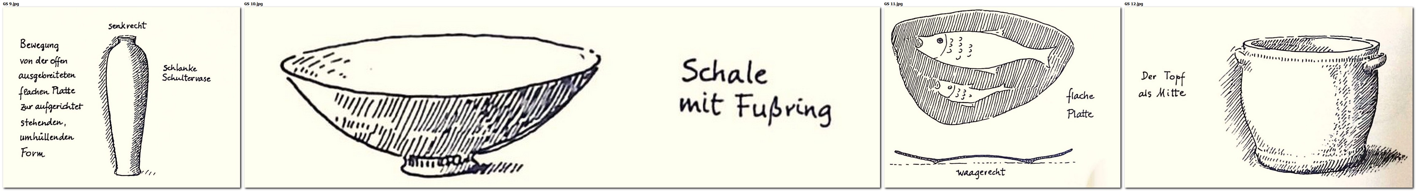 Haben wir eine flache Platte, auf der wir z.B. einen Imbiss mit belegten Broten servieren, dann haben wir so etwas wie die zusammengezogene Tischplatte oder das Tablett, die kleine Tafel. Der Inhalt wird dort nicht lange liegen, er ist zum alsbaldigen Verbrauch bestimmt, er liegt frei und offen zum Zugreifen. Ähnlich ist es beim flachen Frühstücksteller, auf dem wir uns die Brote machen, ähnlich auch beim normalen Essteller; beide haben einen nur leicht erhöhten Rand, um ihren Inhalt zu halten - auch zum besseren Anfassen. Für die Suppe und bei runden, kullernden Früchten brauchen wir außen schon einen höheren Abschluss. All diese flachen Gefäße nehmen auf und geben leicht wieder her, sie halten nichts fest. Wir können diese Geste, die wir auch mit den Händen machen können, an unseren Gefäßformen empfinden und können sie hervorheben, betonen. Bei der Trinkschale, beim Kelch, bei der Müslischale und Salatschüssel wird der Inhalt stärker umschlossen, sicherer gehalten, ebenso bei der Tasse, beim Becher, bei allen tieferen Schalenformen; aber immer noch überwiegt die Geste des Hergebens. Beim Topf nun, der unserer Tätigkeit den Namen gab, haben wir meist steilere, mehr geschlossene, stabile Außenwände. Wir können ihn erleben als die Mitte haltend zwischen Aufnehmen, Bewahren und Hergeben. Es ist eigentlich eine Sammelbezeichnung, bei der man aus dem Wort noch die bäuerlich-urtümliche, schlichte Herkunft abzuspüren vermag.