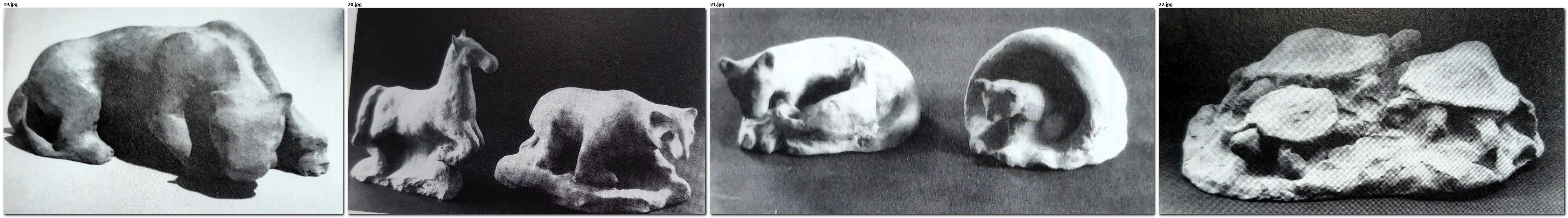 Das Anfangsthema kann man in einer zweiten Phase steigern zu der Gestaltung kleiner Tiergruppen. Bei Schildkröten formen wir zuerst eine großzügige Landschaft, Bodenbildungen, wie man sie in den warmen Mittelmeerländern antreffen kann. Daraus entwickeln wir Tiere, die wie «wandelnde Berge» erscheinen. Die Panzerfläche ist eine sorgfältig zu ertastende Rundform. Eine Katzengruppe beginnen wir so, dass aus einer halbkugeligen Anlage die Rückenformen spielender Katzen entstehen. Hierbei müssen die Bewegungen gut aufeinander abgestimmt werden, so dass man die Gruppe als Einheit empfinden kann. Bei dem aus der Höhle blickenden Fuchs oder Bärchen ergänzen sich die Formen in idealer Weise. Indem die Höhle gebildet wird, entsteht der Tierleib. So fügen sich nicht nur die plastischen Formen zu einer Einheit, sondern auch Tier und Umgebung können in ihrer engen Verbundenheit empfunden werden.