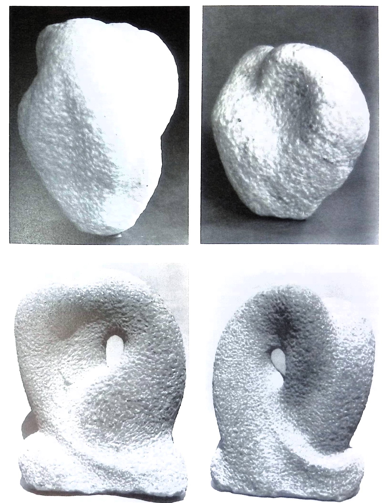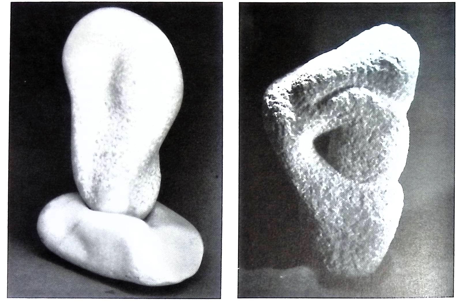 Die Metamorphoseübung betrachte ich als eine gute Grundlage für die Arbeit in Stein. Hierbei wird in großartiger Weise, wenn man im Sinne der altgriechischen Bildhauerei mit dem Spitzmeißel arbeitet[10], ein Erlebnis deutlich, welches den Kreis der Übungen schließt: Eine undifferenzierte rundliche oder aufrechte Form, je nach Maßgabe des Steins, gestaltet sich langsam um, wird vielfältig und bleibt doch ein organisches Ganzes. Wieder werden Wachstumskräfte erlebbar. Mit dem Spitzmeißel eine Fläche Punkt für Punkt durchzuarbeiten, so dass keine Zufälligkeit mehr zu sehen ist, erfordert vom Schüler äußerste Aufmerksamkeit. Wer in den vorhergehenden Jahren noch nicht bemerkt hat, was eine gestaltete, gespannte Fläche ist - trotz aller Bemühung von Seiten des Lehrers kann das vorkommen -, der merkt es jetzt. Die webende Weichheit, die die «gespitzte» Fläche der Form gibt, erzeugt den Schein des Lebens intensiver, als man es vermuten würde.