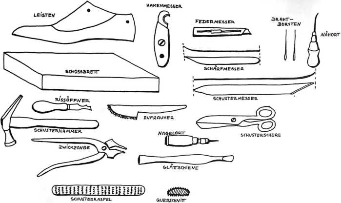 Hier ist ein Sortiment von Schusterwerkzeugen abgebildet, welches für die Schuhmacherepoche ausreicht. Erfahrungsgemäß kommen im Lauf der Zeit noch manche speziellere Werkzeuge dazu.