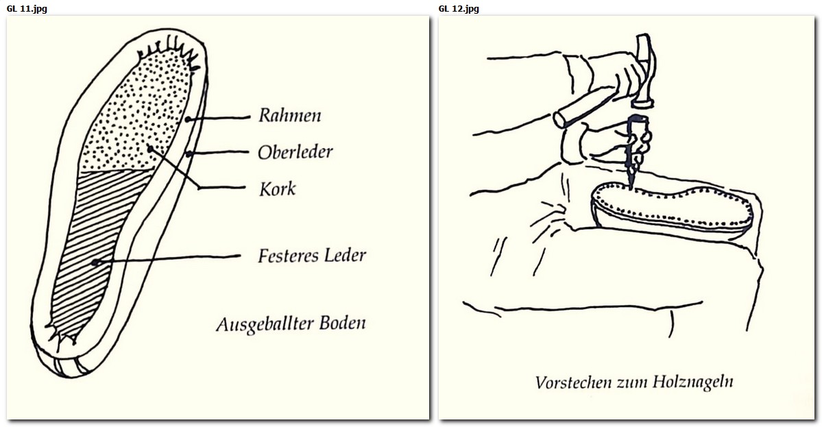 Am neunten und zehnten Arbeitstag wird der tragende Boden, die eigentliche Laufsohle (in der Fachsprache die «Durchaussohle») aufgeklebt und die Löcher für die Nagelreihen vorgestochen. Dann werden die Holznagel eingeschlagen. Spätestens hier zeigt sich, ob der Umgang mit dem Schusterhammer beherrscht wird! Denn nur dann lassen sich die Nägel mit den geforderten drei Schlägen in den Boden bringen und verbinden die einzelnen Schichten zuverlässig.