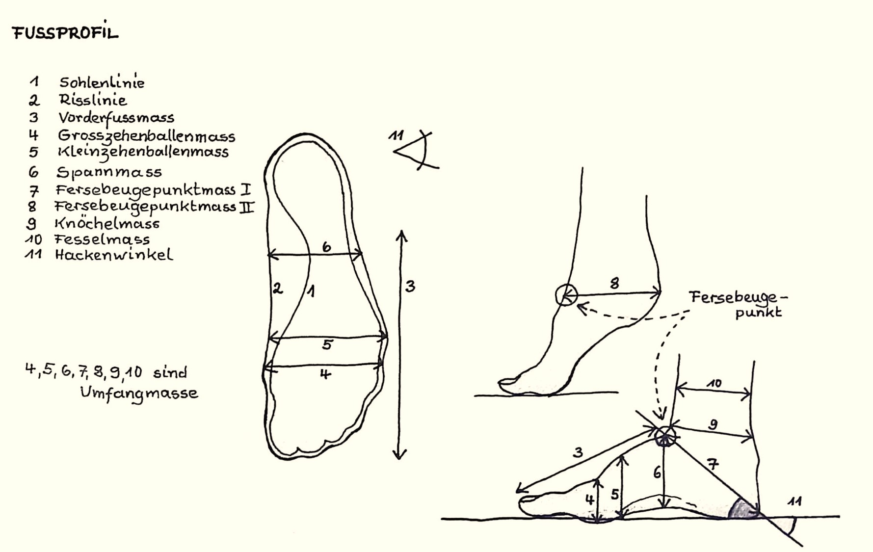 Anschließend vermessen sich die Schüler gegenseitig die Füße. Es werden 18 Maße von den Füßen genommen. Hier entsteht ein direkter betrachtender Kontakt mit den Füßen eines anderen Menschen. Zudem übernimmt der Messende die Verantwortung für die Paßform der Schuhe, die sein Mitschüler anfertigen wird. Die Notwendigkeit zu exaktem Arbeiten entwickelt sich so ganz von selbst. Da in der 9. Klasse das menschliche Skelett Thema des Biologieunterrichts ist, bietet sich das genaue Betrachten des Fußskeletts an. Darauf aufbauend wird über gesunde und weniger gesunde Schuhe gesprochen. Oft bringen die Schüler zur nächsten Stunde verschiedene Schuhe mit.
