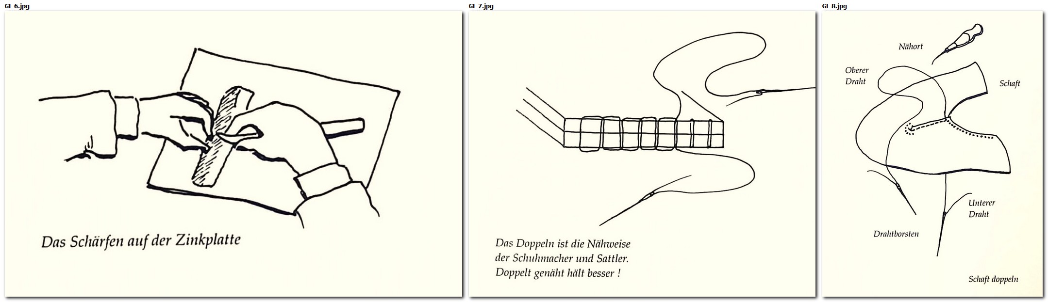 Es wird auffallen, dass sich die Arbeitsgänge so gliedern, dass der Schüler zum einen das Material immer intimer kennenlernt, zum anderen sich die einzelnen Handgriffe in verfeinerter Form bis zur Fertigstellung der Schuhe wiederholen. Dadurch entstehen kaum Übungen, die nicht direkt an einzelnen Teilen des späteren Schuhs gemacht werden. Auch die Vielfalt der einzelnen Arbeitsschritte und Werkzeuge erscheint so bei genauem Betrachten folgerichtig und übersichtlich. Kann beim Walken der Brandsohle der Metallnagel ruhig noch krumm in den Leisten geschlagen werden - «Hauptsache, er hält» -, ist beim späteren Holznageln eine präzise Führung des Schusterhammers erforderlich.