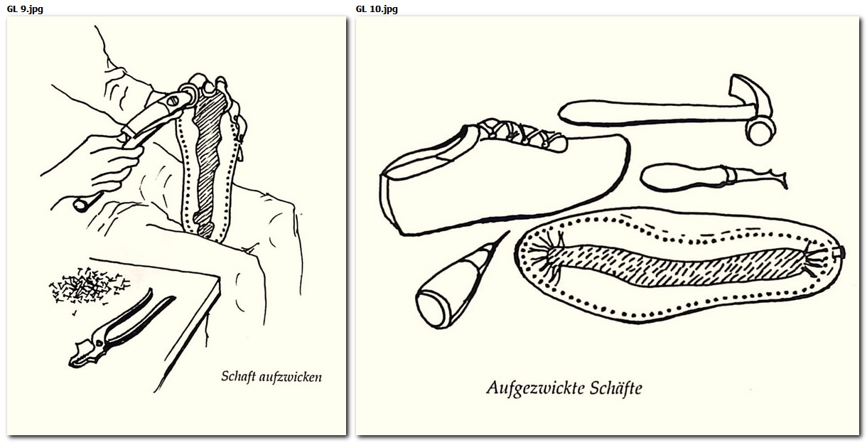 Das Leder muss in nassem Zustand auf den Leisten aufgewalkt werden, damit es sich den Krümmungen der Leistensohle anpassen kann. Das erfordert einiges an handwerklichem Geschick, denn Leisten, Werkzeug und Leder müssen freihändig und auf dem Schoß gehalten werden. So «begreift» man erst die komplizierte Form des Leistens, der im Verlauf der Arbeit durch das darüberliegende Leder immer mehr verborgen wird, aber andererseits das Maß für eine richtige Gestaltung des Schuhs gibt. Beim Walken entsteht der erste, noch recht grobe Kontakt mit dem Leder; doch sind hier schon viele Arbeitsabläufe vorhanden, die zu einem späteren Zeitpunkt in verfeinerter Form wiederkehren.