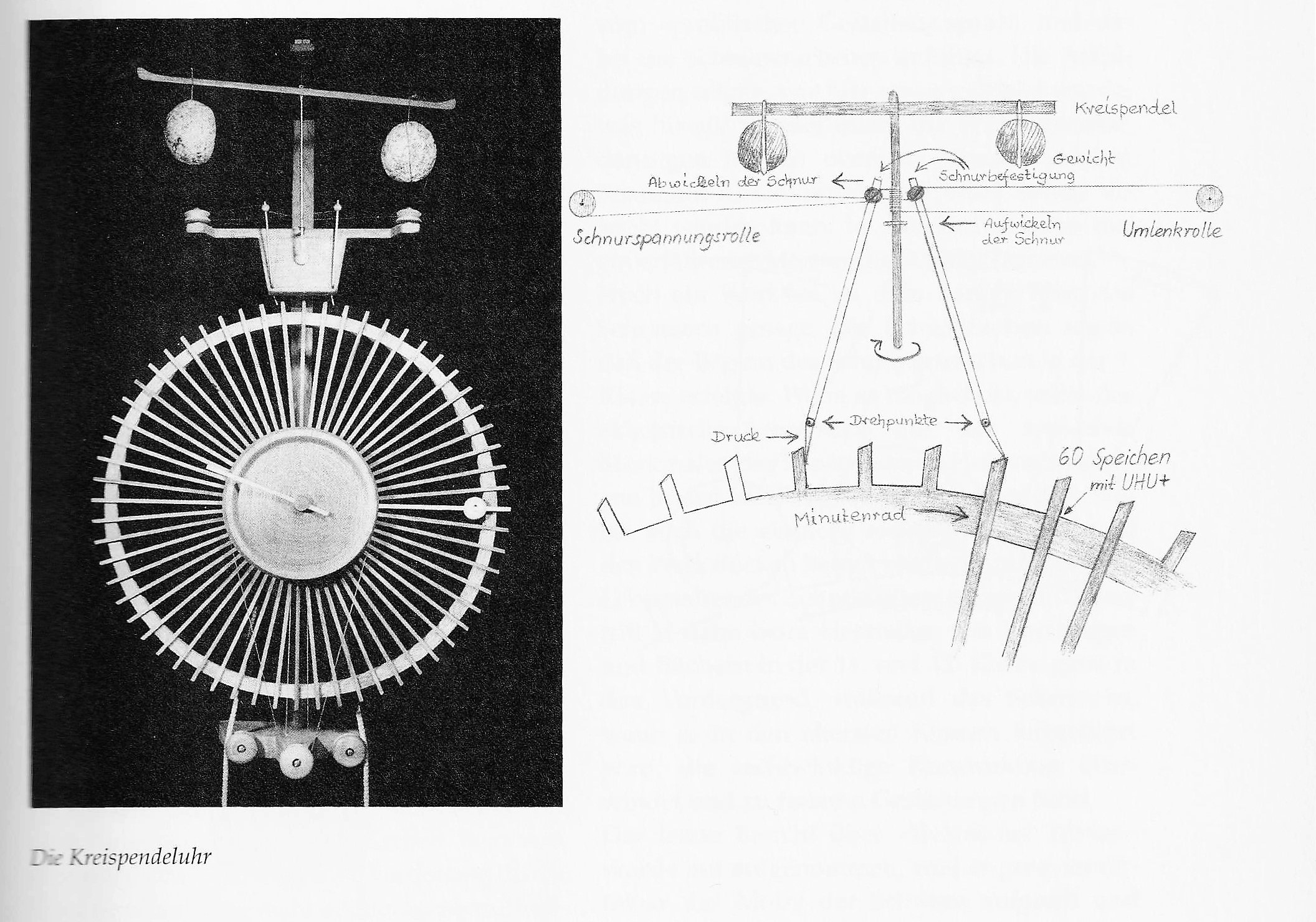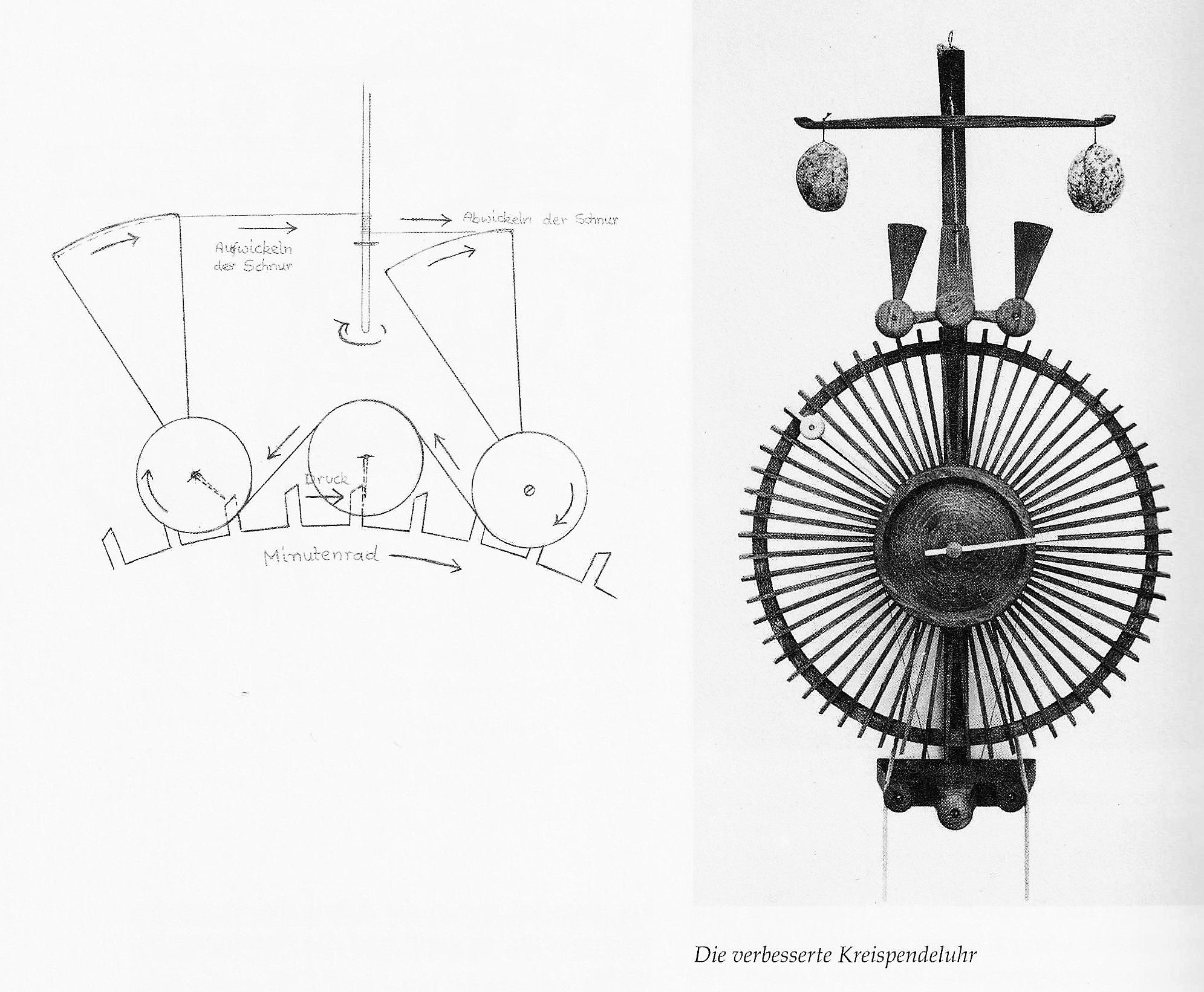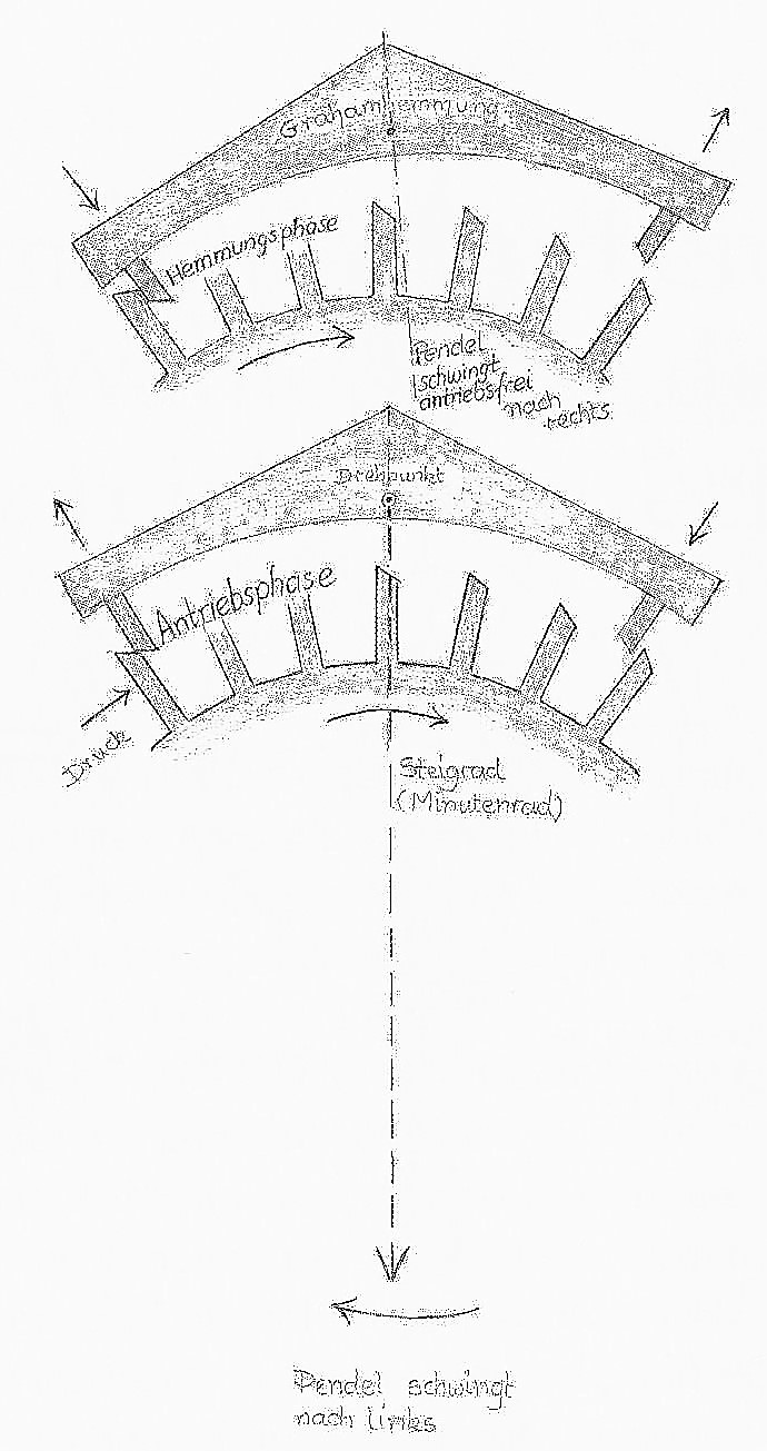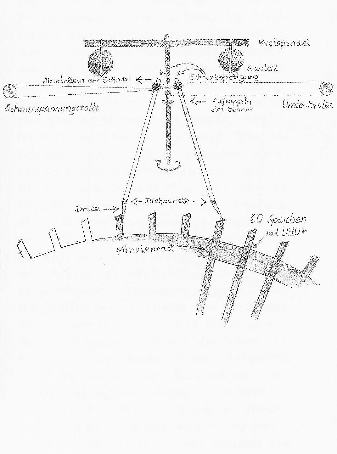 Das Kreispendel dreht sich, von einem Zahn des Minutenrades über Hebel und Schnur getrieben, eine halbe Minute rechts herum, und vom nächsten Zahn getrieben, wieder eine halbe Minute links herum. Durch Verschieben der Waagpendelgewichte kann die Umdrehungsgeschwindigkeit ziemlich genau reguliert werden. Das Sekundenrad entfällt.