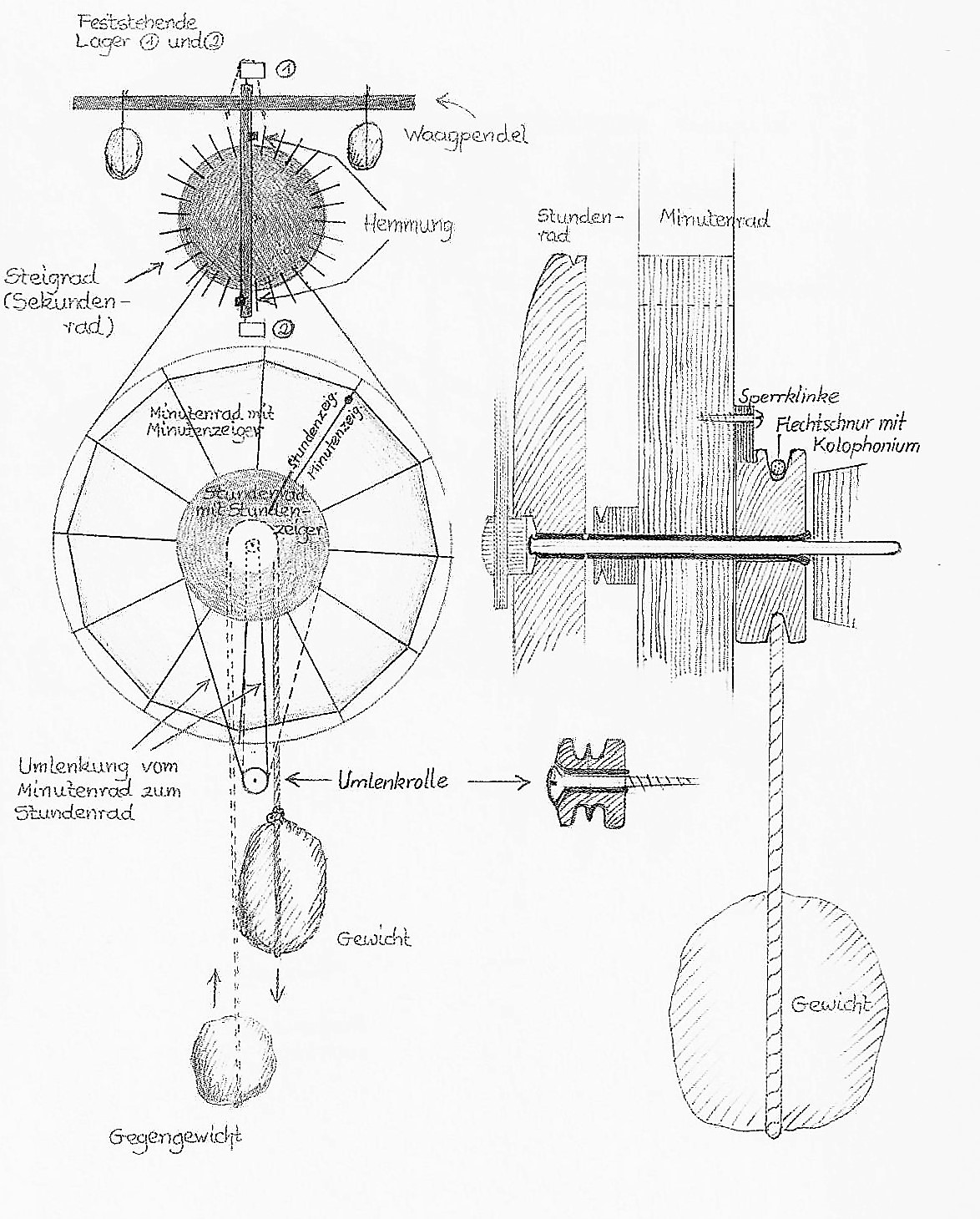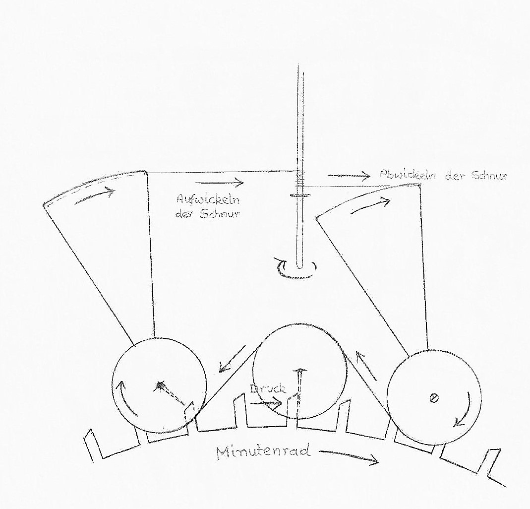 Selbstgefertigte Zahnräder haben zu viel Reibung, Gummiband leiert aus, beim Lederriemen liegt das Problem in der Nahtstelle. Eine praktikable Lösung ist ein mehrfach geführter Faden mit entsprechend kleinem Knoten. Die Untersetzung 12 : 1 vom Minuten- zum Stundenrad ist nur eine Frage des genauen Drechselns.