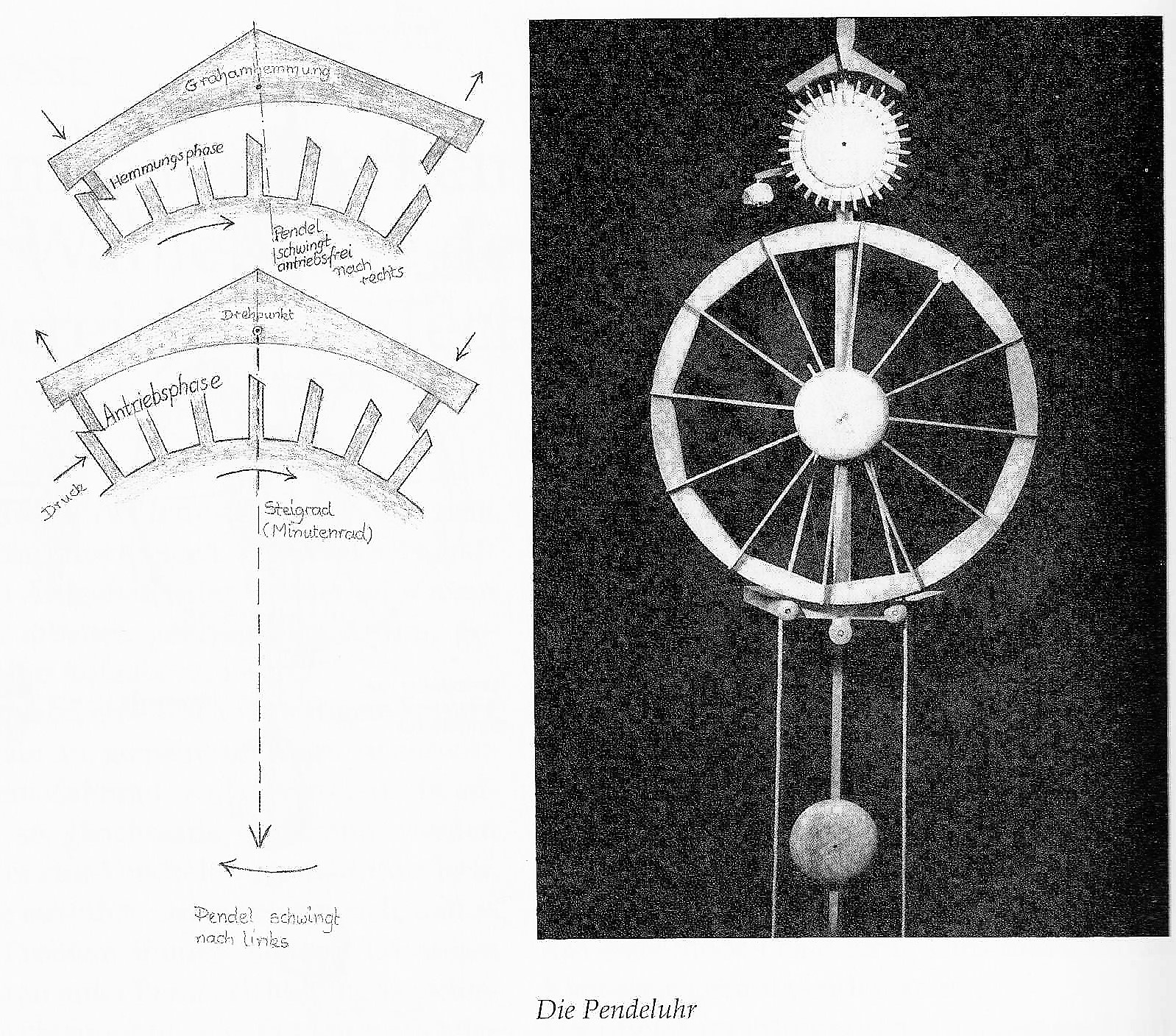 Bei der Pendeluhr wird der Waagbalken durch ein frei schwingendes Pendel ersetzt. Dieses ist in einem über dem Steigrad angebrachten Anker befestigt, der in die Zähne des Steigrades wechselseitig eingreift und die Hemmung bewirkt.