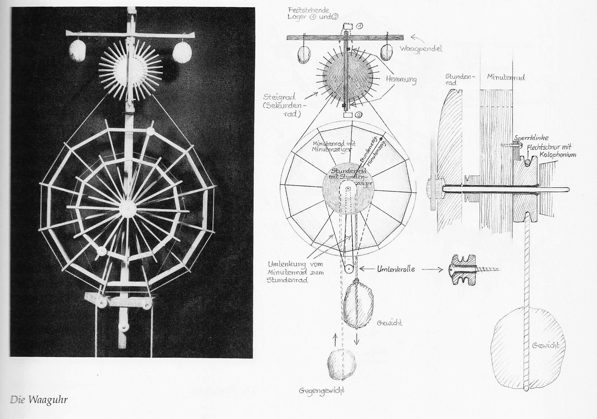 Die mittelalterliche Waaguhr ist die einfachste Form der mechanischen Uhr. Das über der Uhr waagrecht hin- und herpendelnde Waagpendel kann bei entsprechender Größe eine Sekunde hin und eine Sekunde her schwingen. Es ist auf einer senkrechten Achse befestigt. Jeder Zahn des antreibenden Steigrades drückt es durch die in der Achse angebrachten Hemmungen oben in die eine und unten in die andere Richtung. Es muss also für eine Umdrehung pro Minute 30 Zähne haben. Die Schwierigkeit liegt in der Übertragung der Antriebskraft 1 : 60 vom Minutenrad auf das Sekundenrad (Steigrad).