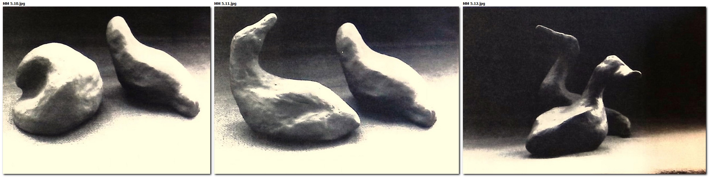 So sehen sich zuerst auch die Grundformen ähnlich, die in der 4./5. Klasse plastiziert werden, weil sie dem organischen Formbildeprozess folgen. Aus dem Druck des Ballens, der Finger, der Handfläche differenziert sich die Tonkugel in die Urform eines Tieres. Da drängt sich der Rücken in den Schultern zusammen,
