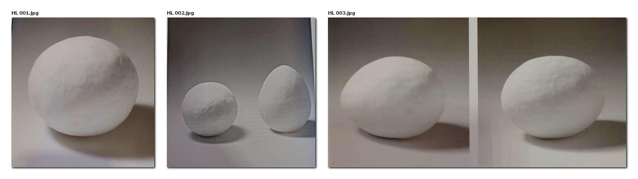 Beim Betrachten der Arbeiten am folgenden Tag wird noch offensichtlicher, was die Lehrerin schon beim Üben am Vortag beobachtet hatte, nämlich, dass einige Kinder die Kugelform nur zaghaft, vorsichtig gedrückt und dadurch nur wenig gestreckt haben, sodass diese noch recht rundlich aussieht. Bei anderen Kindern ist die plastizierte Form in der unteren Hälfte noch ziemlich rund geblieben und nach oben hin zu spitz geworden. Viele Kinder aber haben ihre Form so geschickt gedrückt und gedreht, dass sie sie dabei zuerst nach oben und unten gleichermaßen strecken und dann oben, einem Oval entsprechend, abrunden konnten.