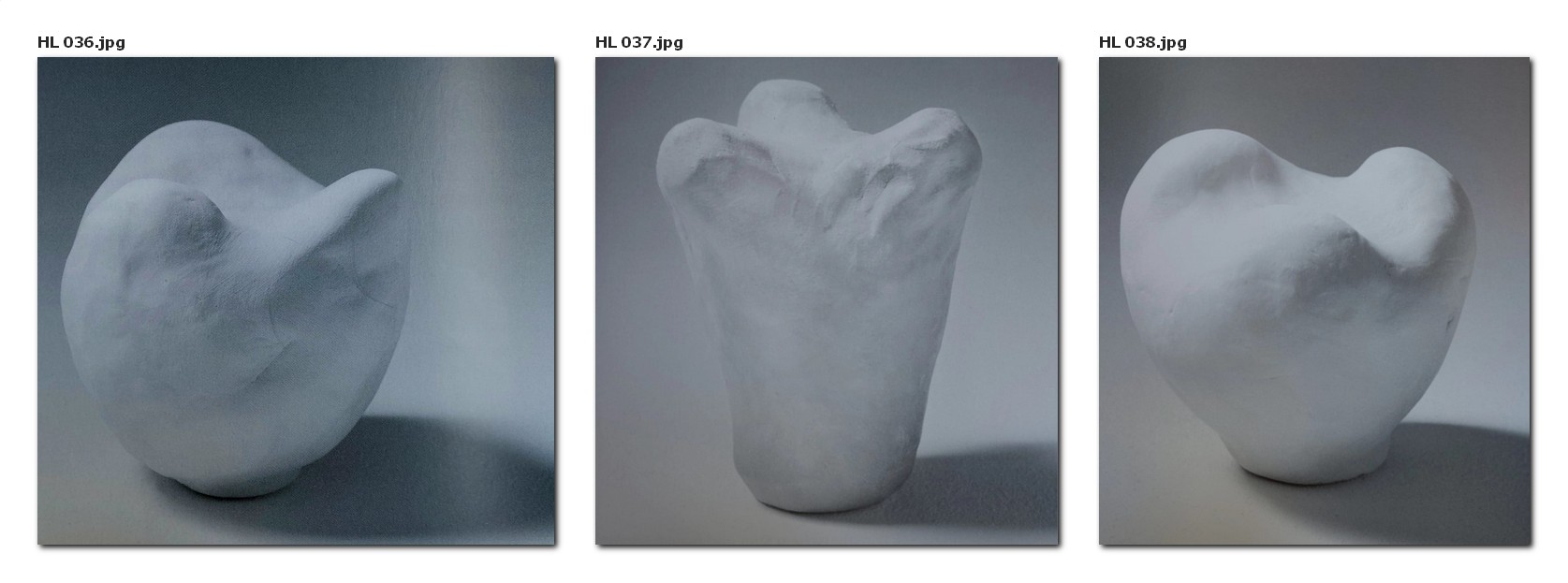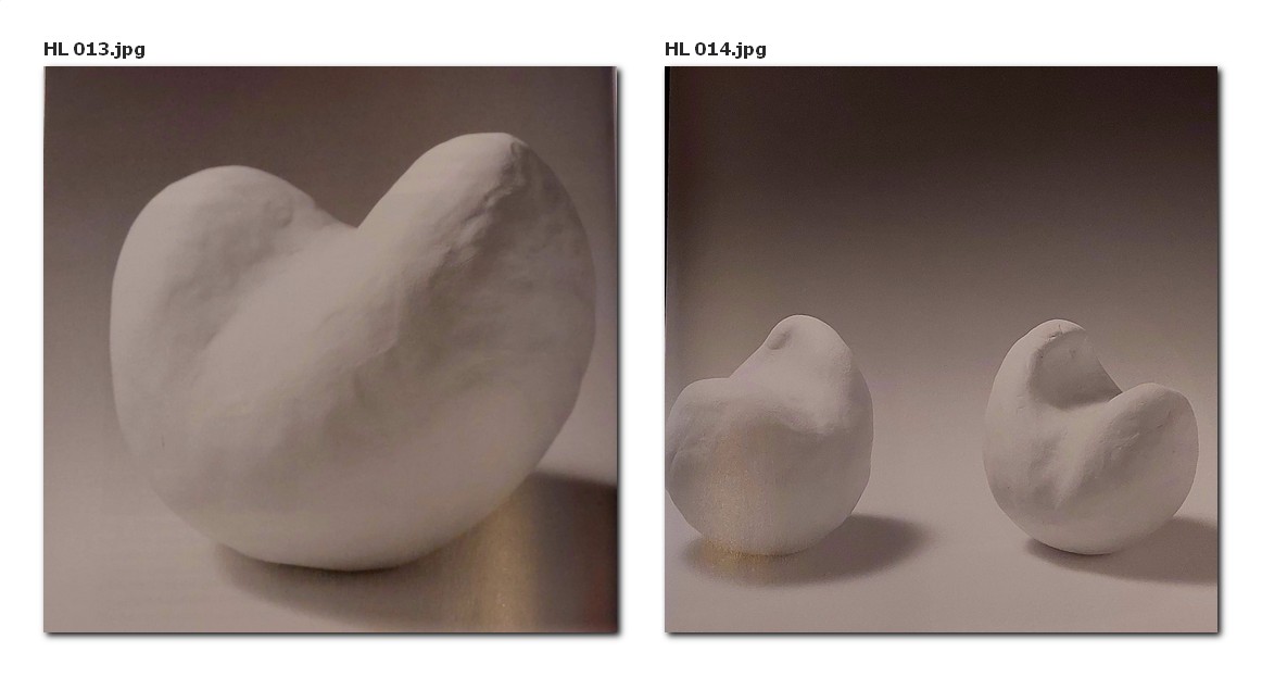 Nach den vorangegangenen Übungen bedarf es bei dieser Form nur weniger Worte zur Anleitung der Kinder. Wir gehen mit ihnen gemeinsam wiederum den Weg von der Kugel zu einem plastischen Oval. Alsdann lassen wir sie das Oval senkrecht auf die linke Handfläche stellen, möglichst so, dass das stärker gekrümmte Ende der Form nach oben gerichtet ist. Dann fordern wir die Kinder auf, mit dem Daumenballen eine Vertiefung in die Mitte dieser oberen Auswölbung einzudrücken. Von da an arbeiten wir weiter wie bei der ersten plastischen Rechts-Links-Symmetrie, bei der wir von der Kugel ausgegangen sind. Dabei kommt es vor allem darauf an, die beiden nun entstandenen Erhöhungen im oberen Teil der Form ganz ausgewogen, also gleich hoch und gleich gewölbt, eben symmetrisch, zu plastizieren, wobei die Übergänge von diesen Erhöhungen zu der dazwischen liegenden Sattelfläche und den übrigen nach außen gekrümmten Flächen auch bei dieser Form „gleitend“ und sanft gestaltet werden sollten. Zum Schluss wird die Form mit sanftem Druck auf das Brett gestellt, damit sie nicht umfällt. Die Kinder müssen dabei gut darauf achten, dass ihre Form ganz aufrecht steht; denn dadurch kommt die Rechts-Links-Symmetrie am schönsten zum Ausdruck.
