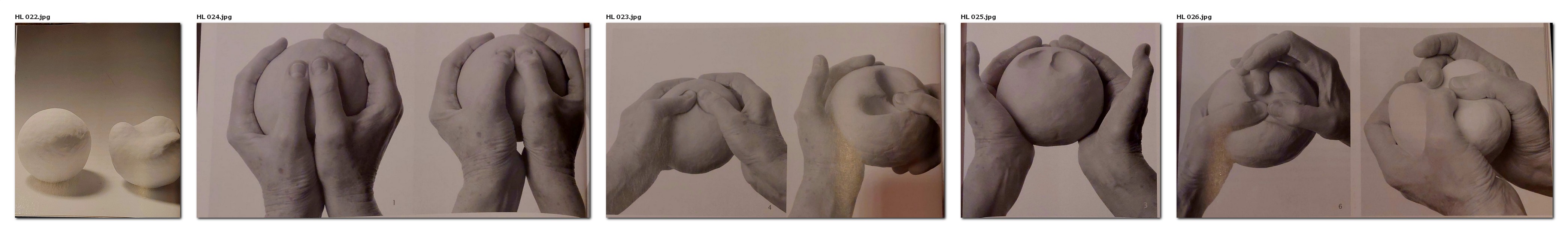 Durch seitliches Drücken mit den gestreckten, nach oben ausgerichteten Händen und durch langsames Weiterdrehen um die gedachte vertikale Achse der Kugel entsteht ein plastisches Oval mit einem mehr spitz zulaufenden und einem rundlichen, stumpferen Ende. Dabei ist die Druckrichtung der Hände horizontal.