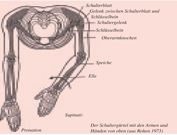 Arme und Hände sind vollkommen auf die freie, von innen geführte Bewegung hin gebildet. Das zeigt sich am Bau dieser Organe bis in viele Einzelheiten. Die Arme gliedern sich mit dem Schultergelenk, d. h. am Schulterblatt an den Rumpf an; das Schulterblatt ist aber ohne direkte Verbindung mit dem übrigen Skelett höchst beweglich in Muskeln eingebettet. Es hat nur durch das Schlüsselbein Kontakt zum Brustbein des Brustkorbes, d. h. zur Atemorganisation. Am Schulterblatt berührt die Gelenkkugel des Oberarmknochens die kleine Gelenkpfanne in einer Weise, dass das Gelenk einen denkbar großen Bewegungsspielraum freilässt. So werden die Bewegungen des Oberarms ganz von der Muskulatur bzw. von den in ihr wirkenden Bewegungsimpulsen bestimmt. Die Beweglichkeit steigert sich dann im Ellbogengelenk durch die Streck- und Beugebewegungen des Unterarms und die Drehbewegungen, durch die der Mensch seine Hände nach oben (Supination), zur Mitte und nach unten (Pronation) wendet. Dann folgen die Bewegungen im Handgelenk und die vielfältigen Bewegungen der Finger. So werden die Bewegungen vom Oberarm bis zu den Händen und Fingern immer differenzierter.