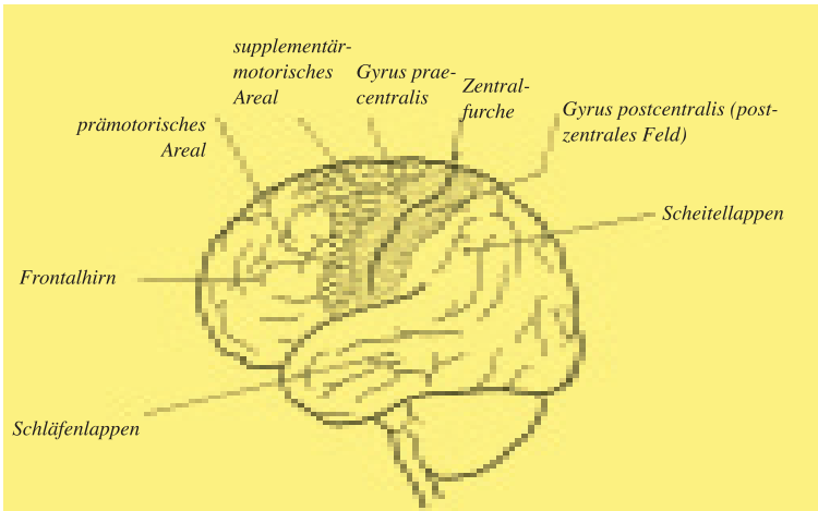 Zugleich geht von den Bewegungen ein Einfluss auf das Gehirn aus. Wir haben bereits darauf hingewiesen, dass der Tast- und vor allem der Bewegungssinn bei den Bewegungen eine entscheidende Rolle spielen, besonders bei den feinen, z. T. äußerst subtilen Bewegungen der Hände und Finger. Dementsprechend sind der Tast- und Bewegungssinn hier auch besonders gut ausgebildet; man hat in jenen Muskeln der Hand, durch die man die Finger beugt, auffallend viele Muskelspindeln (die Organe des Bewegungssinns) gefunden. Vom Tast- und Bewegungsempfinden dringen Wirkungen durch bestimmte Nervenbahnen hinauf ins Gehirn, und zwar zunächst in jene Windung, die hinter der Zentralfurche liegt (postzentrales Feld, Gyrus postcentralis). Auch hier besteht eine geordnete Beziehung zu den verschiedenen Bezirken des Tast- und Bewegungssinnes des ganzen Leibes. Und hier sind jene Areale besonders groß, die wie das der Hand und der Finger unter dem Einfluss einer hohen Bewegungs- und Tastsensibilität stehen.