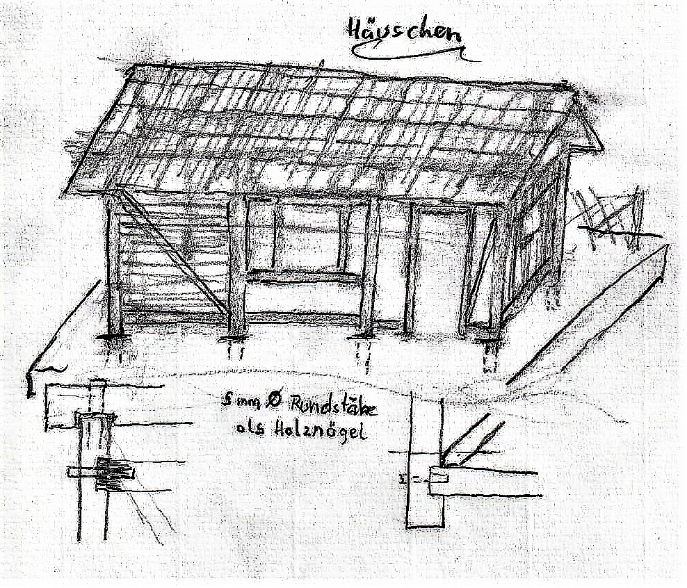 Materialbedarf: dickere Bodenplatte (OSB, ca. 300x400x20mm), Haselnussstecken verschiedene Dicken, Ästchen, dünne Brettchen, Leisten, Stroh, Holzdübel 5mm, Holzleim Werkzeuge: Ständerbohrmaschine, Akkuschrauber, Bohrer 5mm, Forstnerbohrer 15mm, Feinsäge, Winkel, Bleistift, Schleifpapier, kl. Nägel, Hammer, Schnur, Schneidlade, Schnitzmesser Herstellung: Begonnen werden sollte mit einer Planung (Zeichnung von Grundriss und Ansichten mit Bemaßung immer in Millimeter) Die Bodenplatte an den Kanten schleifen. Den Grundriss des Häuschens aufzeichnen. Bohrungen für alle Pfosten anzeichnen (auf rechte Winkel achten). Die Pfosten (10 Stück 100-120mm) zuschneiden. Die Pfostenlöcher an der Ständerbohrmaschine bohren (15mm). Die Pfosten passend zuschnitzen und einsetzen. Die Tragbalken ~ 24 ~ für alle 4 Seiten so abmessen, dass sie einander überlappen (Rundung abschnitzen oder mit der Feinsäge einschneiden und abspalten für eine bündige flache Auflage auf allen Pfosten). Alle Balken fertig vorbereiten. Schließlich senkrecht in alle Pfosten durchbohren und 5mm Holzdübel bündig einschlagen. An den Giebelseiten 10mm überstehen lassen, um den Stützpfosten (50mm) für den First aufzusetzen. Der Firstbalken soll auf beiden Giebelseiten 20mm überstehen, anpassen, ablängen, Auflage ausschneiden, durchbohren, Dübel setzen. Fenster + Türe: Sturzbalken zwischen Pfosten einpassen. Die Pfosten ausklinken und die Balken passend auflegen und stramm einsetzen. Passende Tür- und Fensterpfosten anfertigen und mit Nägeln fixieren… Querriegel (zwischen alle Pfosten) zuschneiden, Diagonalaussteifungen an den Ecken anpassen. (Tipp: wo es wackelt, nageln oder schrauben…) Dachstuhl: Sparren vom First zur Fette (Dachüberstand!) zuschneiden (gleichmäßiger Abstand, ungerade Zahl), Dachlatten quer dazu aufnageln. Deckung: Holschindeln spalten und von unten beginnend auf die Lattung leimen; Strohhalme ablängen und auf die Dachschräge legen, auf den Latten festbinden. Wandverkleidung: einfache Deckelschalung (senkrecht) aus Leisten, Blockhausbalken, Fachwerkgerippe mit Ästchen und Ton ausschmieren, Steine suchen und ausmauern… Besonderheiten: Sehr komplexe Aufgabenstellung, was für detailverliebte, geschickte Kinder, Tüftler, gut für Gruppenarbeit, Aufgabenteilung, gegenseitiges Helfen, sich absprechen, korrigieren, überblicken… Klasse: 3 (zur „Hausbauepoche“)