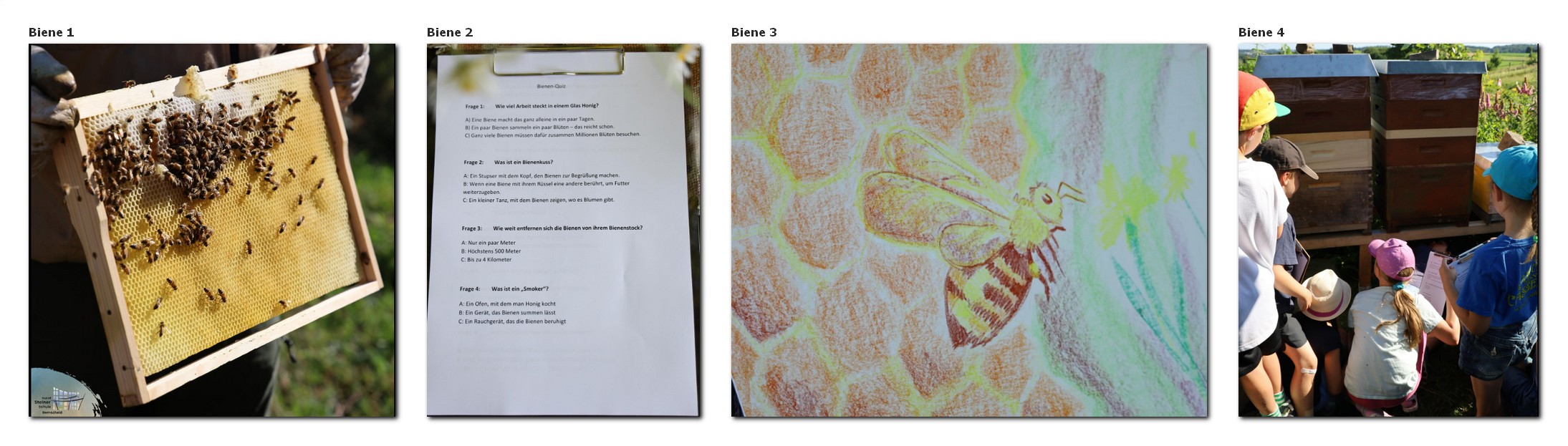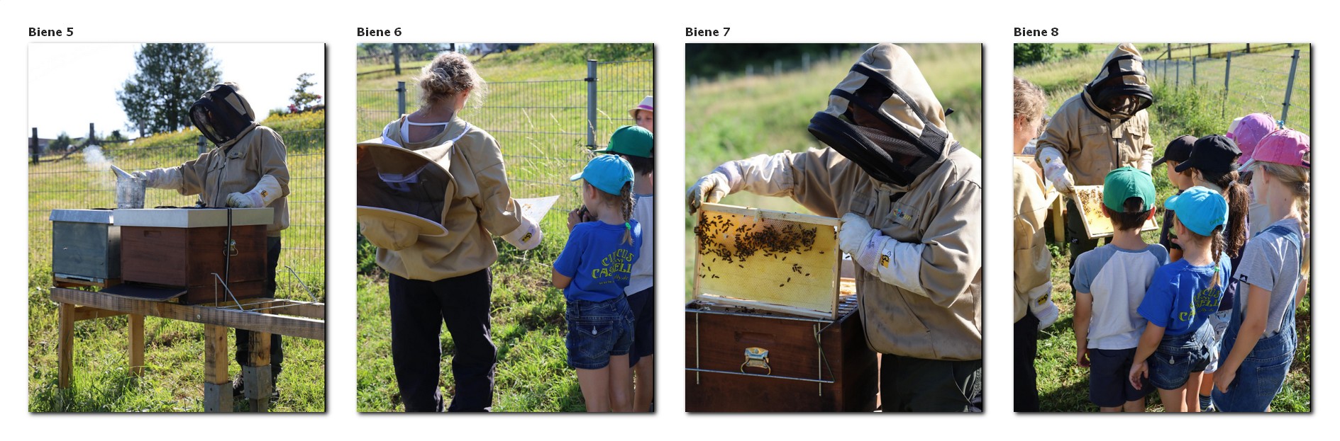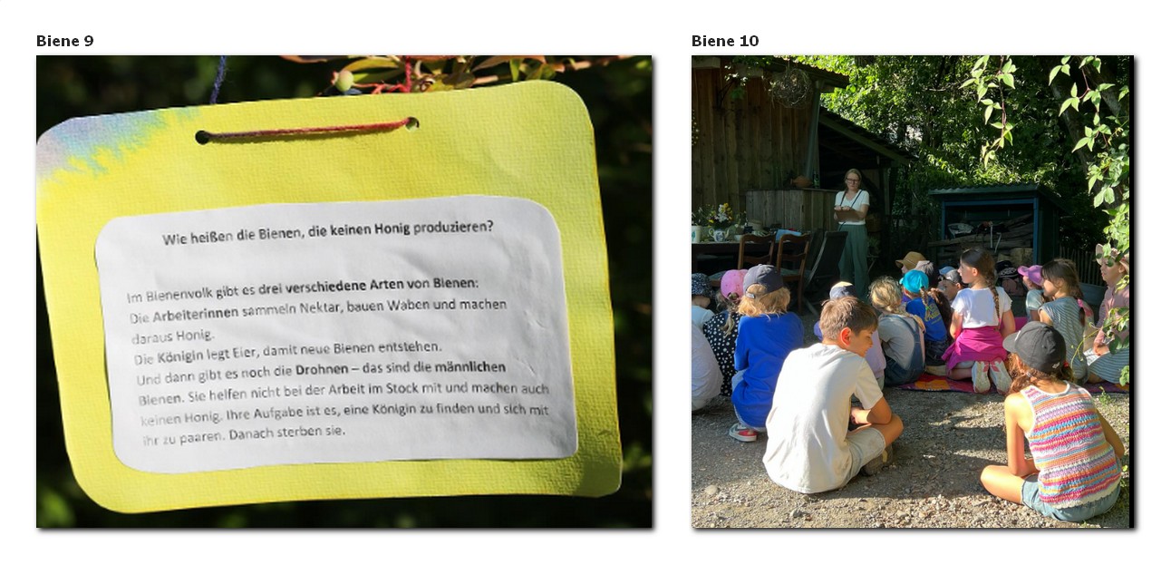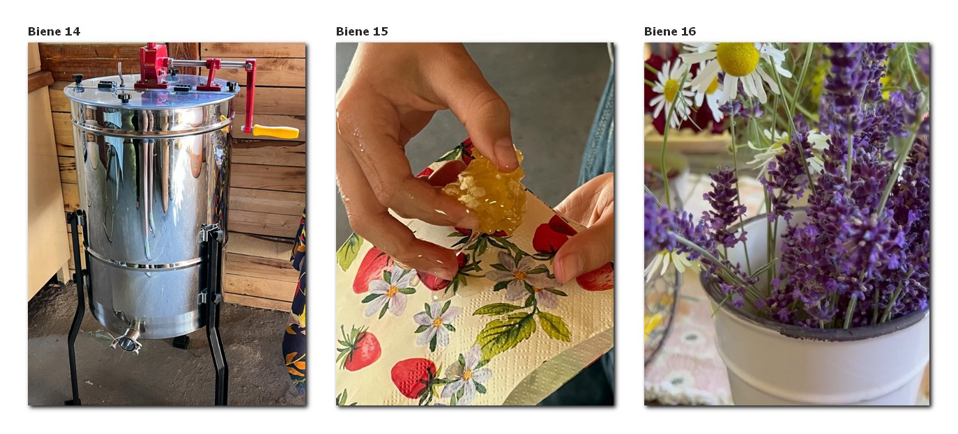 Tag 2: Besuch beim Imker: Bienen-Rallye, verschiedene Stationen: Bienen-Rallye in Kleingruppen (2-3 Kinder) im Garten, die Bienen im Bienenstock beobachten mit dem Imker, Lavendel ernten, Bienenwaben genauer betrachten und ein Stückchen von einer frischen Honigwabe abschneiden und probieren. (Wachs kauen und Honig essen.)