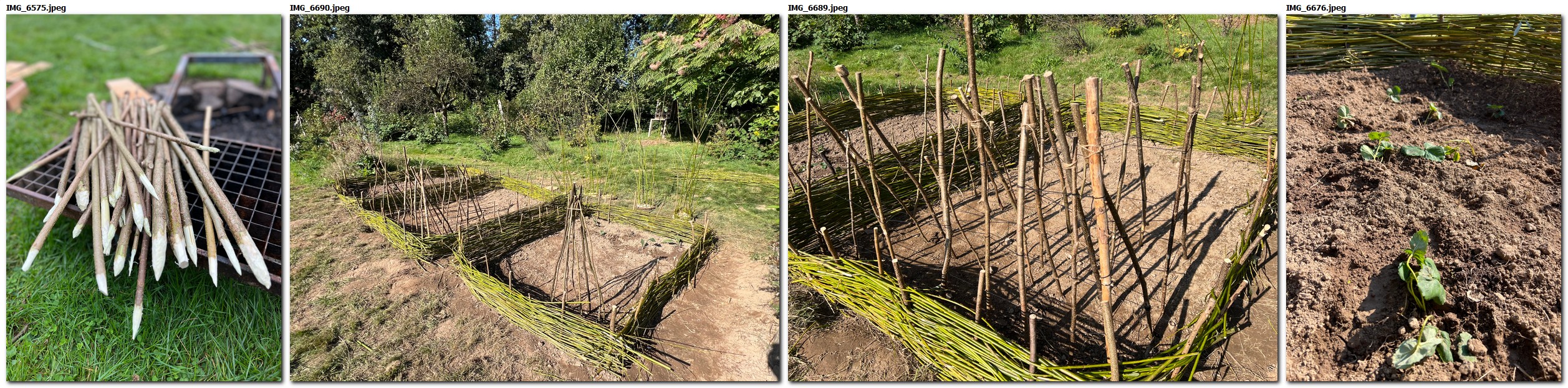 In erster Linie geht es um das Tun, einen Zaun flechten. Dafür sind ein paar Vorbereitungsarbeiten nötig. Ideal ist es, wenn alles, was man braucht am Ort zu finden ist: Haselstecken wachsen am Waldrand, Weidenruten spießen aus den Kopfweiden hervor, an einer anderen Stelle, am Wiesenrand, das Stück Beet, das angelegt werden soll befindet sich an einer Stelle, wo es schön sonnig und licht ist, vielleicht mitten auf der Wiese, aber doch auch da, wo es sich einfügt in die Anlage des gesamten Gartens. Werkzeuge, die für die Arbeiten benötigt werden, sind vorhanden.