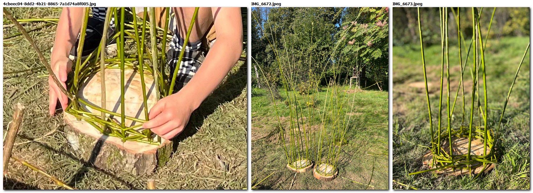Die Finger sind ständig in Bewegung, führen das Material, die Augen folgen dem Tun und achten darauf, dass dieses regelmäßig ausgeführt wird, drüber und drunter, rechts und links. So sperrig und hart Weiden werden, wenn sie trocknen, so weich und biegsam sind sie, wenn sie frisch vom Baum geschnitten werden. Im Sommer stehen sie natürlich voller Laub. Der Korbflechter schneidet sie deshalb lieber im Winter, wenn sie ihr Laub verloren haben. Für die Kinder ist es allerdings ein Heidenspaß, mit einer Rute “Tauziehen” zu spielen und dabei die Blätter abzustreifen, immer und immer wieder, Rute um Rute, an Gabelungen müssen die Zweige abgeschnitten werden. Diese Stellen wären für den Korbflechter unbrauchbar, weil das Geflecht an diesen Stellen leicht bricht. Für unsere Zäune spielt das keine Rolle, wir können alles verarbeiten und in das Ganze einflechten.