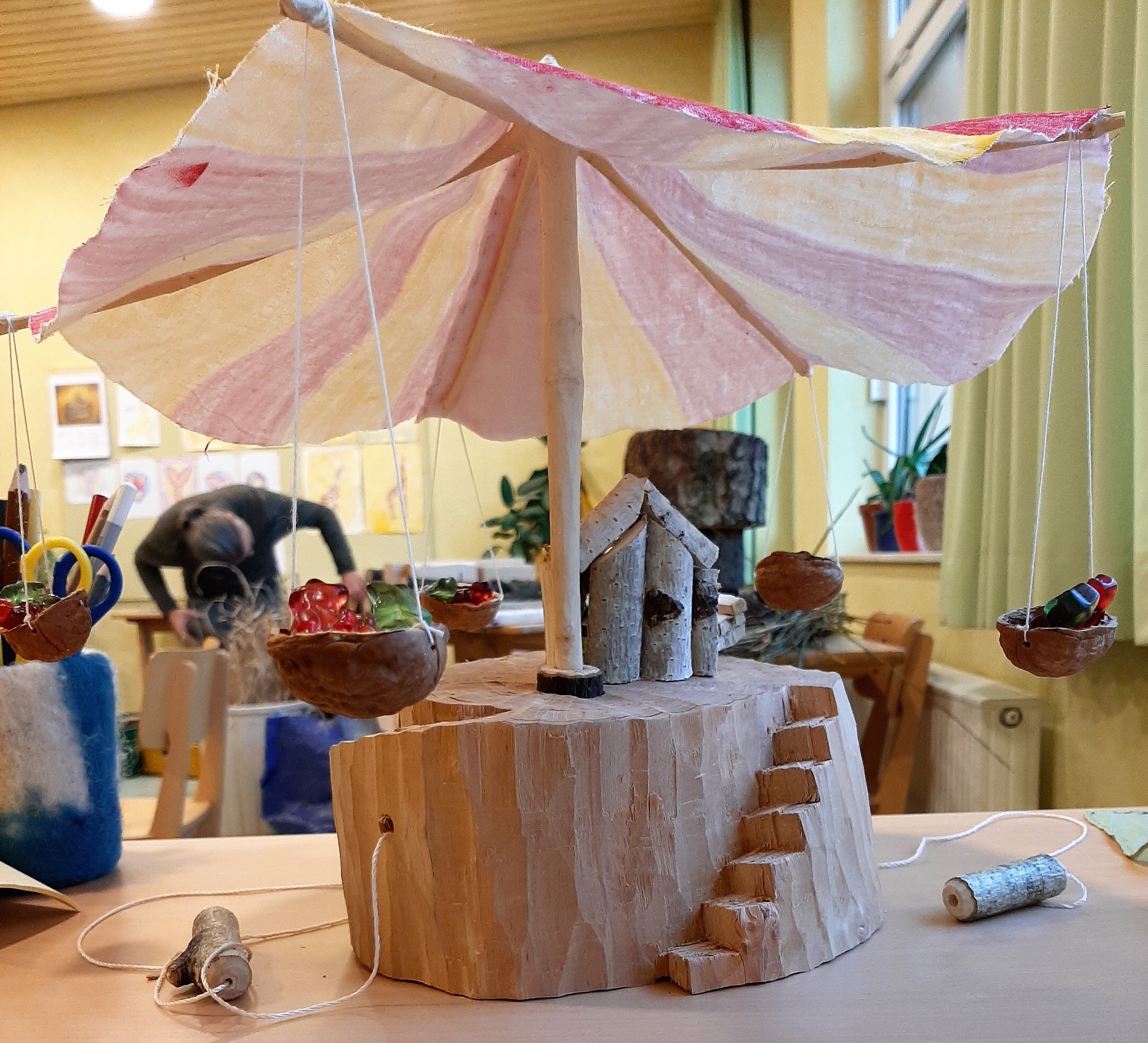 Materialbedarf: Tannenbaumspitze, dicke Baumscheibe 25cm, Schnur, dünner Faden, Holzdübel, Polsternagel Werkzeuge: Ständerbohrmaschine, versch. Forstnerbohrer 20, 25, Schalungsbohrer 10mm, Holzbohrer 10mm, 2mm, Akkuschrauber Herstellung: Tannenbaumspitze (2. Ring) abschneiden, schälen, Loch senkrecht (20/25), ca. 7cm tief, mit 10mm durchbohren, Polsternagel in Holzdübel einschlagen, Dübel von unten einschlagen. Nussschalen am Rand einbohren, 3 Löcher, Faden einknoten, an die Ästchen hängen. Besonderheiten: Variante zu der einfachen per Hand drehbaren Variante: Fadenantrieb per Seilzug (hin und her…): Schnur wird von beiden Seiten auf der Achse verknotet, eine Seite wird aufgewickelt, beide Schnurenden werden durch das Loch nach außen gezogen. Mit Knopf oder Knebel verknotet. Klasse: 3 - 5
