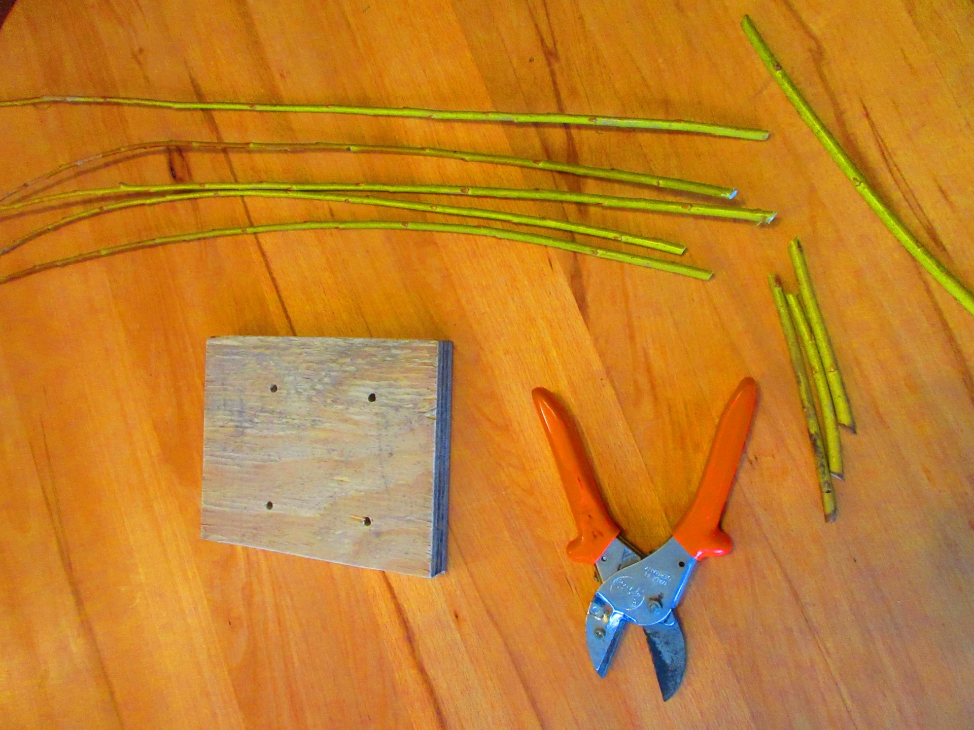 Für das Körbchen für Meisenkugeln braucht man fünf gleich dicke etwa 80 cm lange Weidenruten. Als Arbeitsunterlage eignet sich ein Brett, in das vier Löcher im Abstand von ca. 8,5 cm in rechteckiger Anordnung gebohrt werden. Die Dicke der Löcher richtet sich nach der Stärke der Weidenruten; sie müssen leicht eingesteckt werden können und sind ggf. vom unteren Ende zu kürzen.