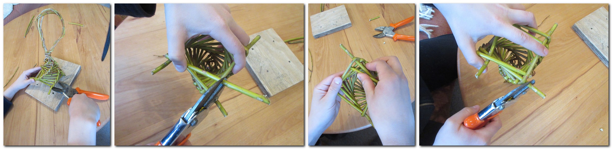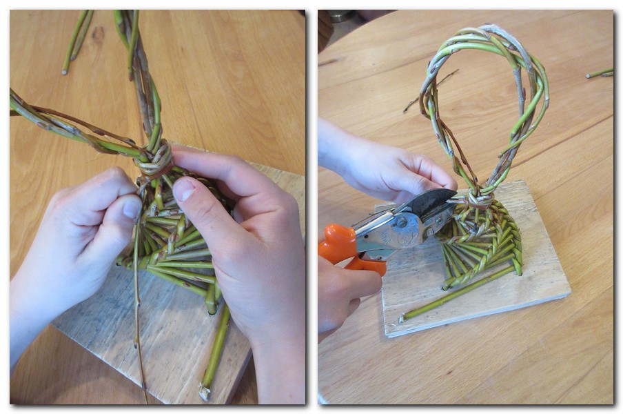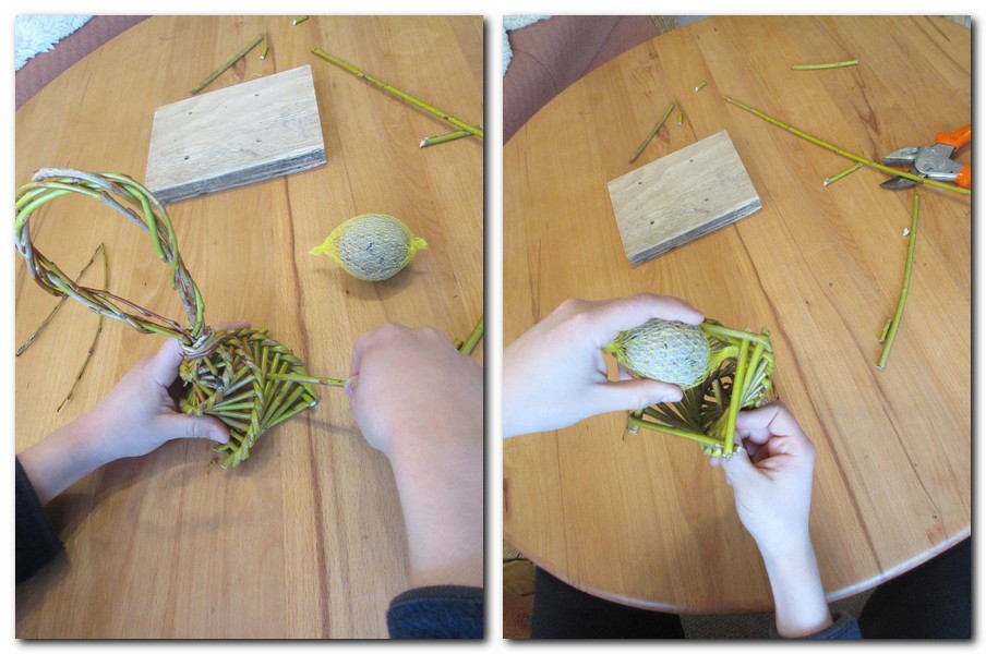 Wichtig: Damit das Geflecht nicht zu locker wird, sind die Weidenruten immer direkt an der Knickstelle um zu biegen und dicht nebeneinander zu halten. Für Arbeitspausen ist eine Wäscheklammer oder ähnliches notwendig.