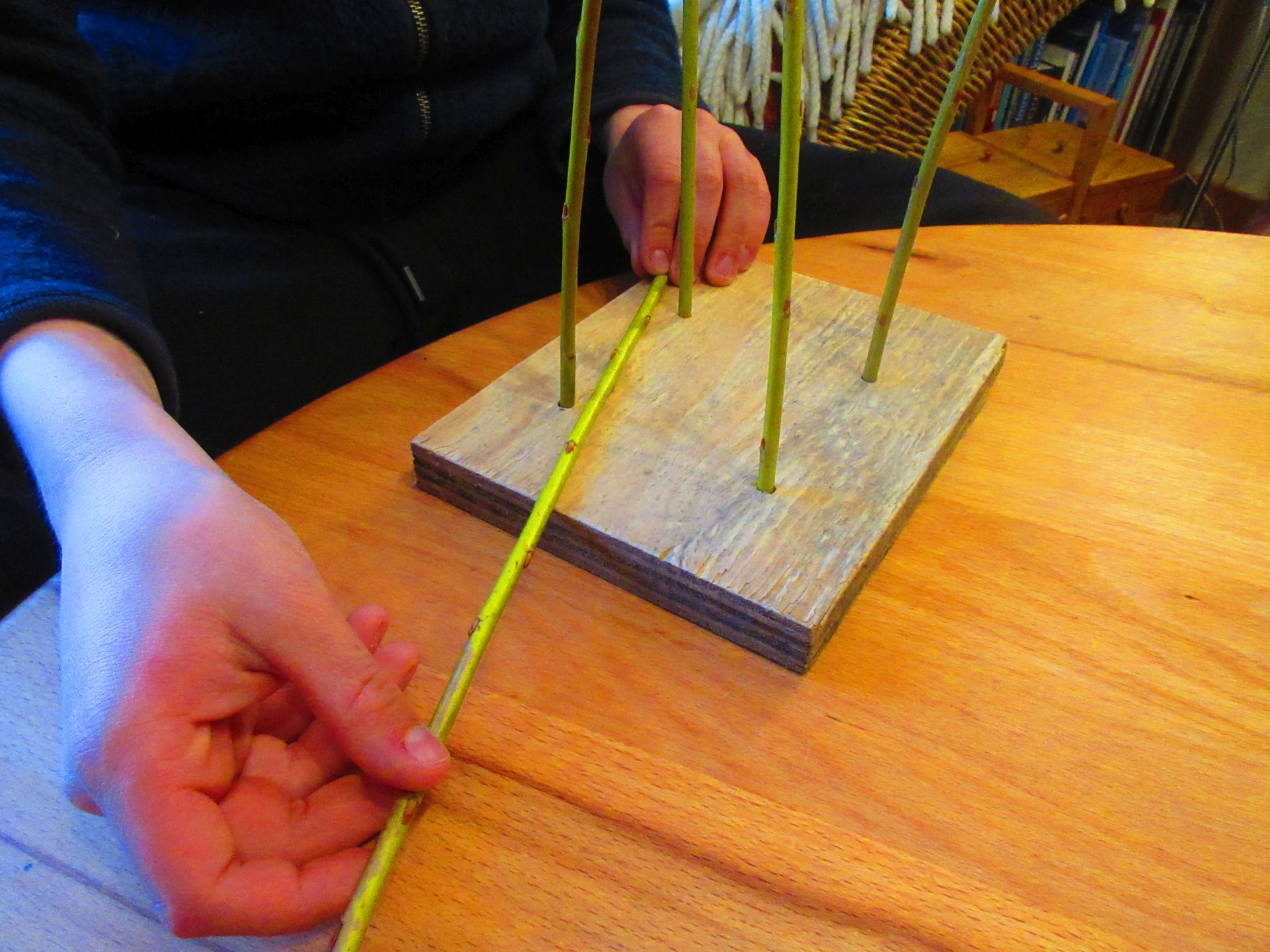 In das Bett werden die 4 Weidenruten senkrecht eingesteckt. Nachdem 4 Ruten aufrecht in die Löcher gesteckt wurden, wird die fünfte Rute flach so eingelegt, dass sie vor der linken aufrechten Rute (Stake) und hinter der rechten Stake flach aufliegt. (In dieser Anleitung wird gegen den Uhrzeigersinn geflochten. Für Linkshänder eignet sich die umgekehrte Richtung, wobei die Angaben von rechts und links entsprechend geändert beachtet werden müssen.)