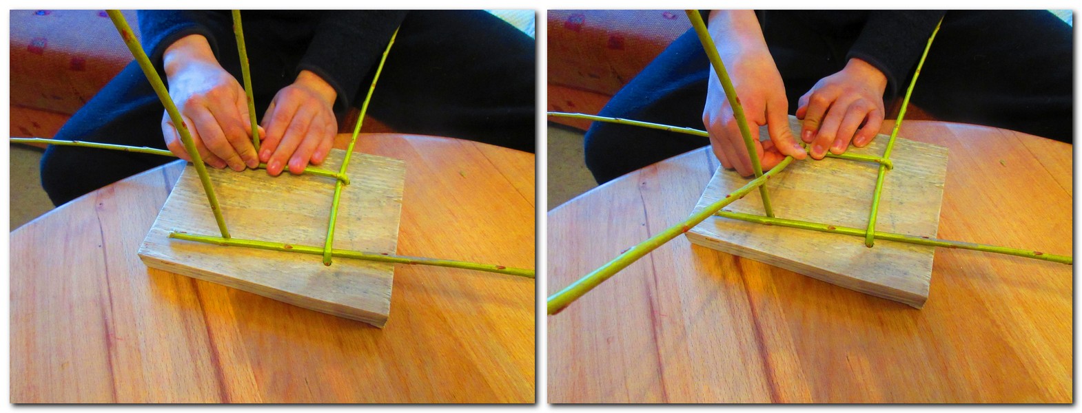 Die rechte untere Stake wird über die die flach liegende Rute nach vorne geknickt, sodass sie an der Innenseite der nächsten aufrechten Stake vorbei läuft. Danach das Brett um eine Vierteldrehung mit den Uhrzeigersinn drehen, sodass immer an der rechten unteren Seite gearbeitet wird (für Linkshänder andere Dreh- und Flechtrichtung).