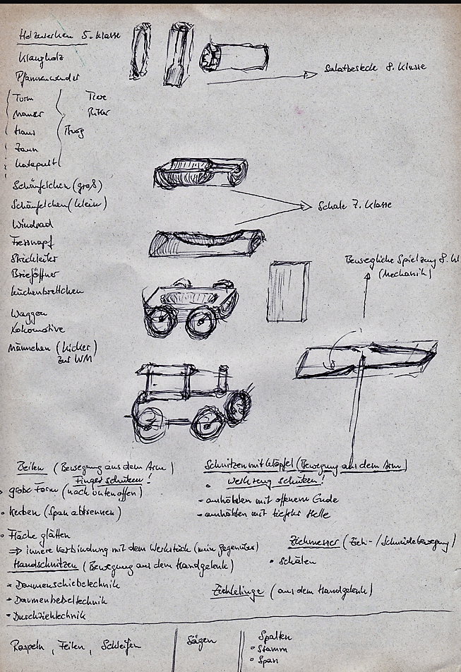 "Im Unterricht gehen die Kleinen zunächst mit der Wolle um. Weich, warm und schmiegsam fügt sie sich der formenden Kinderhand, durch deren Wärme auch das Wachs formbar wird. Das Holz erfordert schon einen festen Zugriff, den die «Mittelstüfler» beim Schnitzen und später auch beim Korbflechten haben müssen.