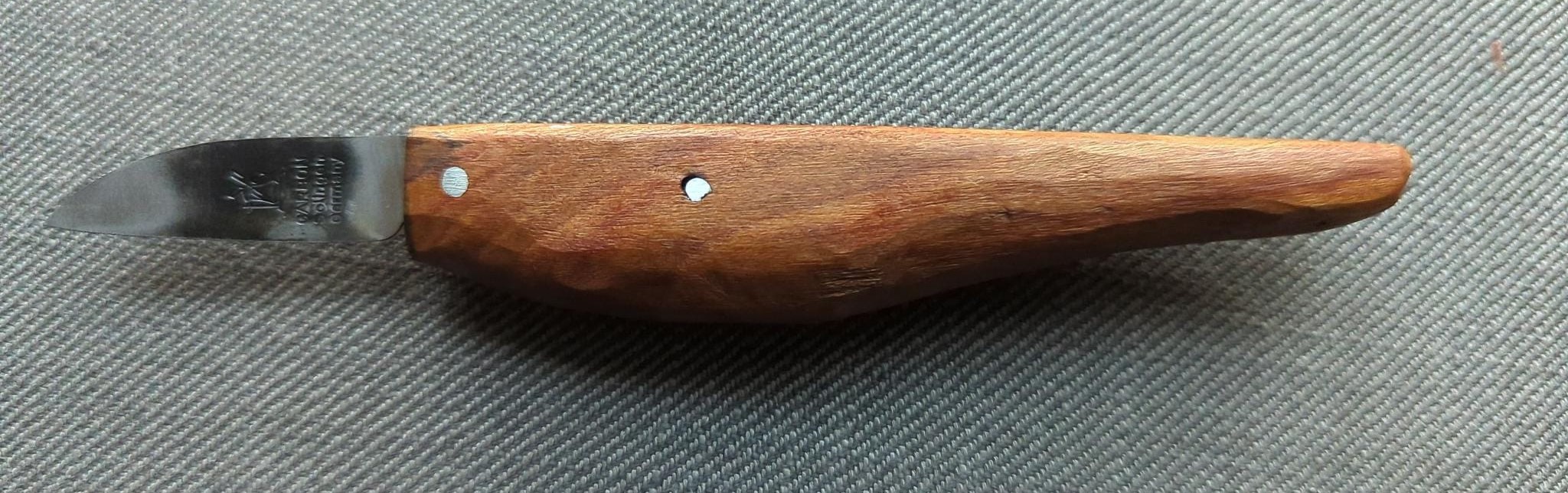 Materialbedarf: Laubholz ca. 20 x 2,5 x 2,5cm Werkzeuge: Schnitzmesser, Leim, Zwinge, Feinsäge, Hammer und Schraubstock, Werkzeugschleifmaschine, Stechbeitel 10mm Herstellung: Messergriff schnitzen, schön schlank am Klingenende, eine Rundung der Klingenhülle am langen Stück bearbeiten, dann Messerhülle absägen und Hülle und Griff fertig schnitzen. Hülle spalten, Klingenstärke ausheben, verleimen. Messer einsägen (Sägeschnitt sollte zur Materialstärke des Rohlings passen), Löcher für Alustifte bohren, Klinge einsetzen, Stifte einschlagen. Besonderheiten: Verletzungsgefahr beim Ausheben der Klingenstärke. Vorritzen durch den Lehrer und/oder Einspannen in die Werkbank ist zu empfehlen. Schön, wenn die Messer nachher mit dem Brennpeter und Holzöl behandelt werden. Klasse: in kleineren Gruppen ab Klasse 3.